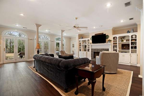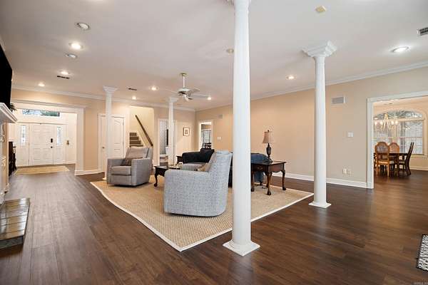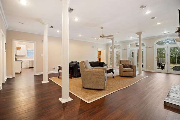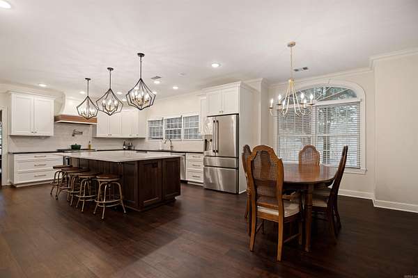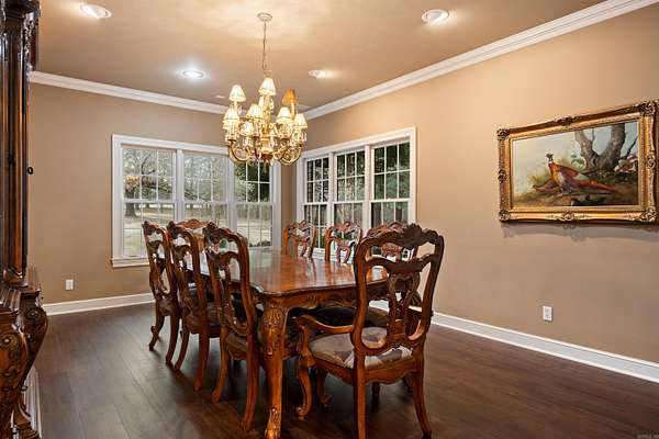 An extraordinary private estate, thoughtfully designed for comfort, elegance, and retreat. Situated on 9.25+- acres within Jonesboro city limits, this remarkable residence offers over 6,500 square feet of beautifully appointed living space, providing a rare balance of privacy and convenience. The home has been thoughtfully remodeled, featuring a stunning kitchen equipped with Electrolux appliances and designed to serve as a central gathering space. Heated floors enhance everyday comfort, while abundant storage and generous closet space throughout the home. The primary wing serves as a true sanctuary, featuring a private balcony overlooking the wooded surroundings, a walk-around closet, and a spacious, spa-like bathroom. All additional bedrooms are generously sized with large closets, offering comfort and flexibility. An upstairs living area provides space for an office, music room, or additional lounge, while an unfinished area offers potential for a custom theater or media room. Perfect for both entertaining and everyday living, this estate offers a sense of peaceful escape rarely found inside city limits--yet remains just minutes from all that Jonesboro has to offer.