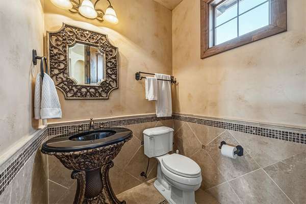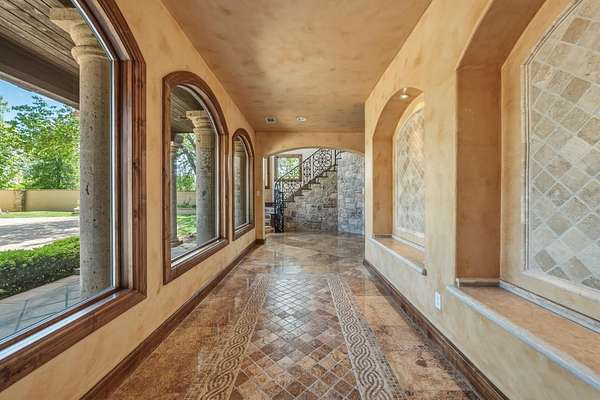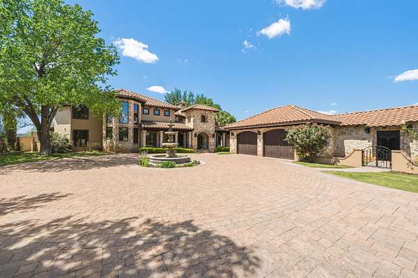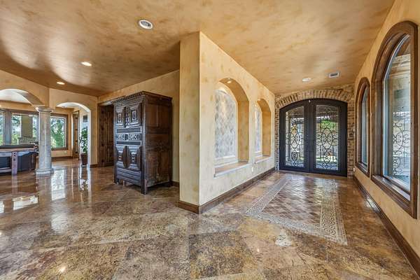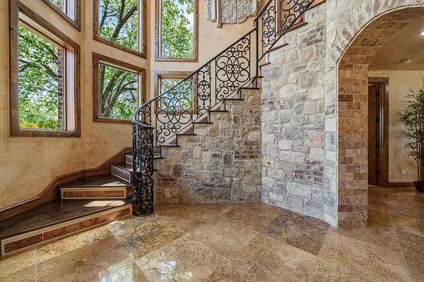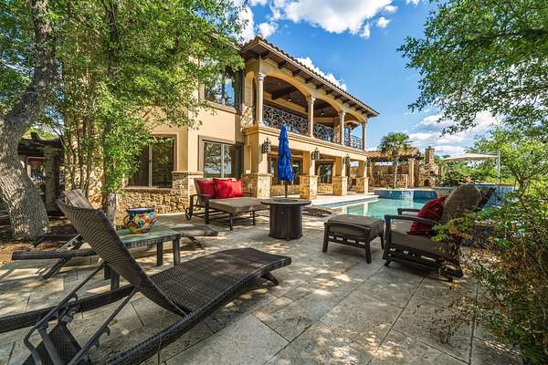 Breathtaking waterfront gated estate offering the ultimate private retreat. This 4,910 sq. ft. Estate is a resort-style sanctuary tucked behind artistic wrought-iron gates with a grand circular drive and a flowing fountain. The backyard is an entertainer's dream, featuring a sparkling negative-edge pool, waterfall, spa, and a full outdoor kitchen with a custom rustic wood-fired pizza oven. Boaters will enjoy a private dock with a 24' boat lift, dual wave runner lifts, and a spacious sun deck for soaking up Hill Country views. Inside, grand soaring windows, polished marble floors and exquisite ironwork lead to sophisticated living spaces. The gourmet kitchen boasts knotty alder cabinetry, granite counters, and a hand-carved stone fireplace. The lower level is designed for fun with a fully equipped home theater, living room, and three spacious guest bedrooms. This level gives you direct access to your outdoor pool, spa and dining areas. A separate private-entry Guest Villa provides the perfect space for a home office or guest suite. Car enthusiasts will appreciate two detached 2-car garages, both fully insulated with dedicated HVAC. From the luxurious primary suite with a clawfoot tub and private balcony to the panoramic upper-porch views, this home offers uncompromising luxury in a prestigious setting. Experience the beauty of the Hill Country on your own private shoreline.