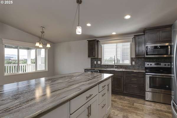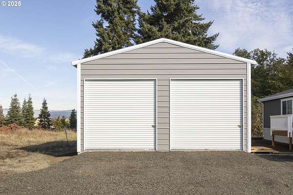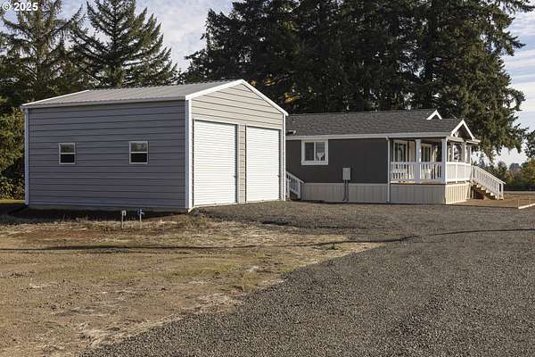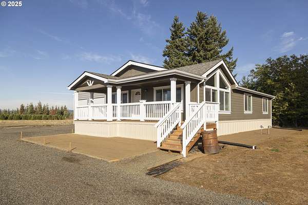 0.5 mi to Hwy 18 - Territorial views - 24*25 shop - 2023 one-level home on 90 acres. Inviting rural escape with wide-open vistas and functional acreage near Sheridan and McMinnville. The 2023 Skyline Athena model offers single-level living with 2 bedrooms, 2 baths, and 1,296 sq ft of bright, efficient space. Open-concept kitchen features a large island, solid-surface counters, and modern cabinetry adjoining a comfortable living area with solar-tube lighting. Primary suite includes a soaking tub and double vanity. The home sits on approximately 10 acres dedicated to the homesite, mature oak grove, and access roads, surrounded by an 80-acre Christmas tree farm lease (through 2028) that adds privacy and scenic beauty. Enjoy territorial and tree-farm views from the covered deck. Detached 24*25 steel garage/shop with dual 10' roll-up doors plus a pump house near the home site. Gravel driveway connects to paved Red Prairie Rd for easy commute routes 0.5 mi to Hwy 18 and 5.3 mi to Hwy 22. Well and septic in place, EFU zoning. Experience peaceful country living with space for gardens, hobbies, and nature watching all within minutes of town conveniences and wine country destinations.