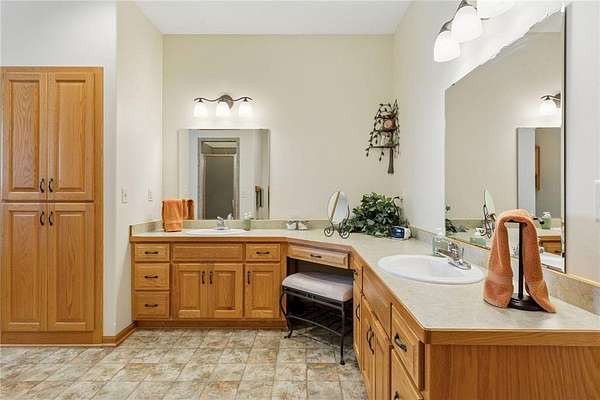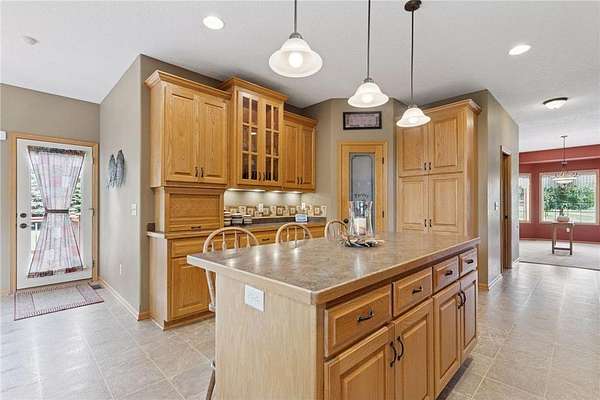 The spacious custom kitchen features a large center island, ample cabinets with upgrades, and built-ins throughout. The main floor primary suite is inviting and generous in size, complete with a sizable walk-in closet and a luxurious large bathroom suite.