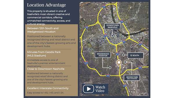This versatile property offers excellent potential for business owners, investors, developers, creative agencies and owner-occupants. Ideally situated between 12 South and Wedgewood-Houston and minutes from Geodis Park and Downtown Nashville, it combines a prime location with long-term value in a market where opportunities like this are increasingly limited.