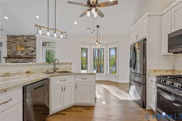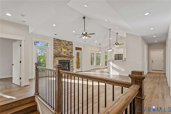 - Bath In Primary Bedroom, Bay Window, Bedroom On Main Level, Breakfast Area, Cathedral Ceilings, Ceiling Fans, Dining Area, Double Vanity, Fireplace, High Ceilings, Jetted Tub, Laminate Counters, Main Level Primary, Pantry, Recessed Lighting, Separate Formal Dining Room, Walk In Closets