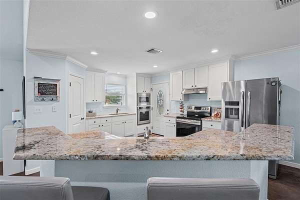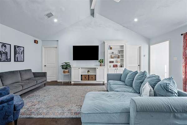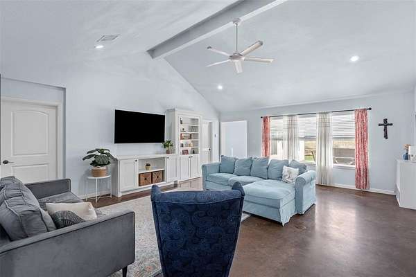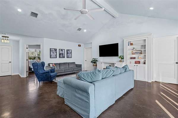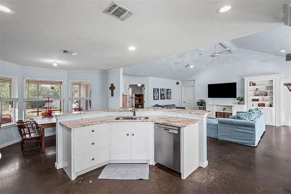 Step inside to discover an open-concept design that seamlessly connects the inviting living & dining areas. The living room, distinguished by its vaulted ceiling & custom built-ins, provides a welcoming atmosphere for relaxation or entertaining. The spacious kitchen serves as the heart of the home, boasting dual sinks, a generous pantry, & a breakfast bar accommodating numerous barstools, perfect for morning meals & social gatherings.