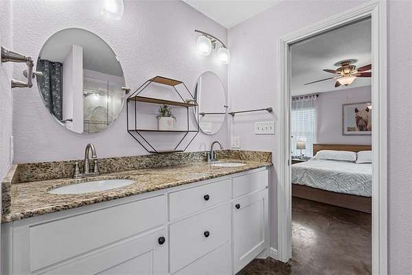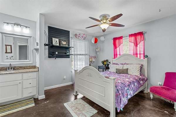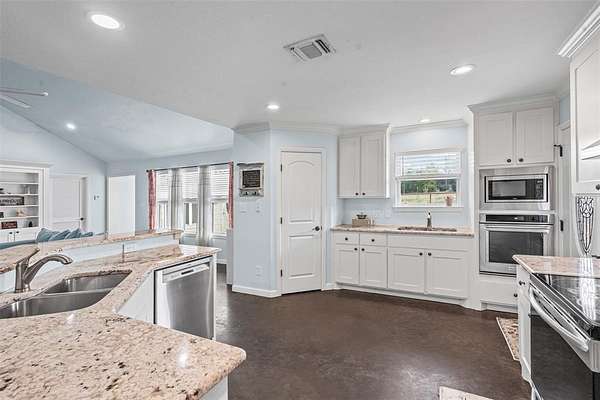 For added peace of mind, an underground storm shelter is accessible from within the home, providing security in inclement weather. You'll be surprised to find the separate fully equipped guest quarters with a bedroom, bath, & kitchen, affording privacy and comfort.