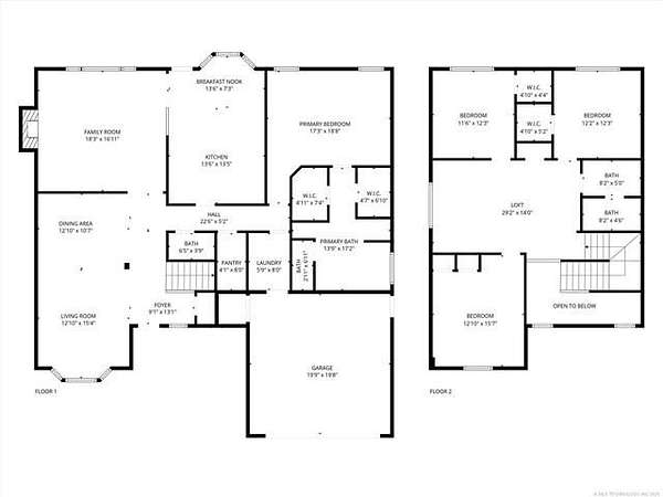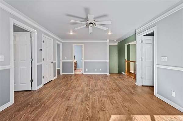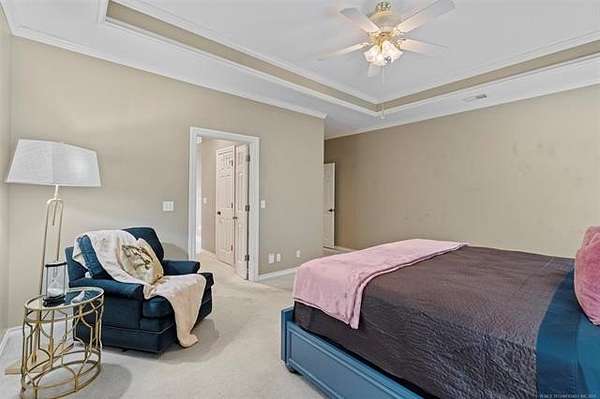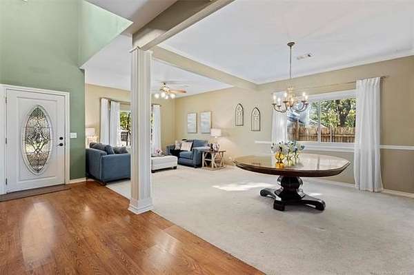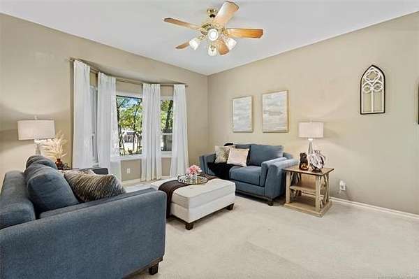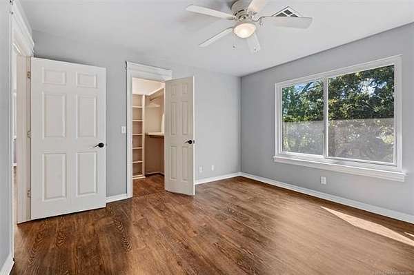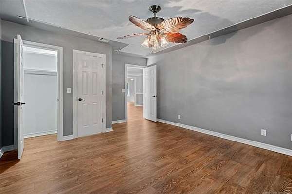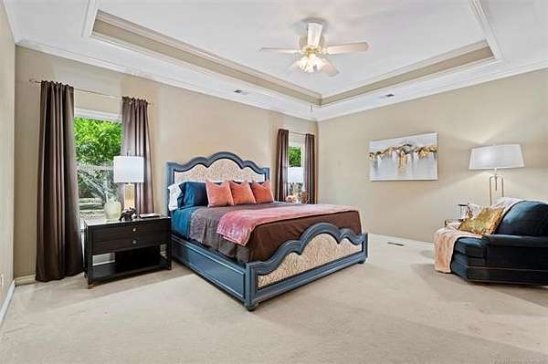The primary suite includes a recessed ceiling, two large walk-in closets, and a calm, airy atmosphere. Upstairs, you'll also find two additional walk-in closets for generous storage. Throughout the home, there are multiple ceiling fans, two bay windows, and durable LVT flooring on both levels.