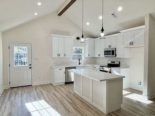 Est $1,272/moGORGEOUS NEW HOME ON 3.62 QUIET ACRES SURROUNDED BY WOODS! This beautiful 3 bedroom 2 bath home has an open floor plan with cathedral ceilings, white shaker cabinets, and gorgeous quartz counters throughout. Beautiful wood beam and black fixtures really show the quality details! Custom wood shelving and a master closet to die for! Gorgeous pond, and back. These are not actual photos but of same builder plan. Materials/colors may vary.