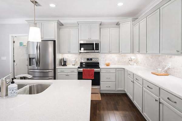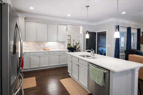 The kitchen is the heart of the home and is beautifully appointed with a LARGE CENTER ISLAND, QUARTZ COUNTERTOPS, STONE BACKSPLASH, UPGRADED CABINETRY with CROWN MOLDING, and GENEROUS PREP and STORAGE SPACE. Just off the hall, a FULLY FINISHED WALK-IN FLEX/STORAGE ROOM offers exceptional versatility for a HOME OFFICE, HOBBY SPACE, CRAFT ROOM or ORGANIZED STORAGE. The LAUNDRY ROOM adds convenience with UPPER CABINETRY AND A UTILITY SINK.