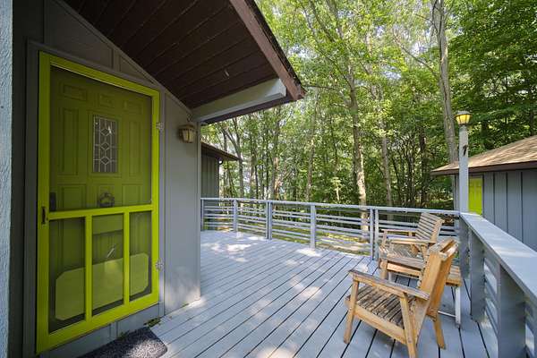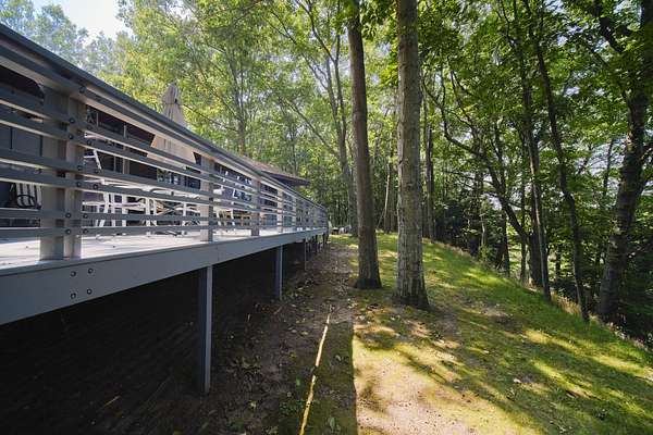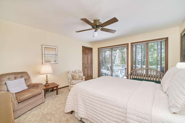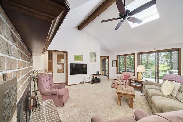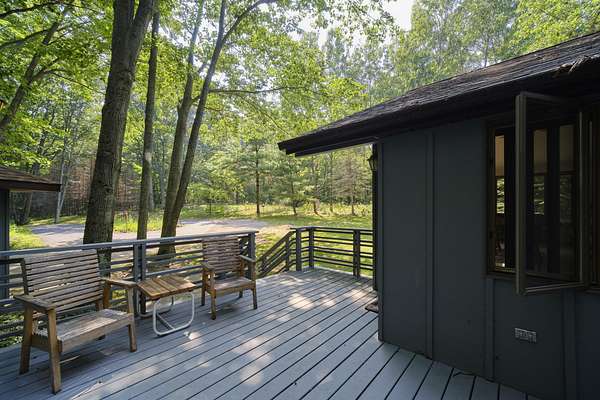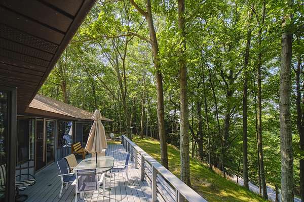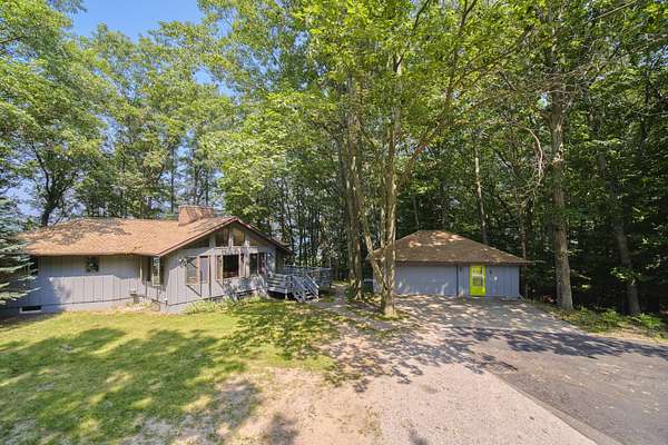 Perched on a hilltop overlooking Portage Lake with 300' of shared but private beach frontage, you'll find this 4 bedroom, 4 bath home. The custom built, architect designed contemporary home is nestled into nearly 7 wooded acres of privacy. The main floor has two master suites and an open floor plan, and the home is angled to capture wooded views of Portage Lake from the large windows and expansive deck on the lake side. The walk out lower level has a large family room and an additional bedroom. The detached garage features guest quarters, with an additional bedroom and bath. A short walk down the driveway and across the road you'll find a winding path to 300' of sandy beach frontage on Portage Lake, shared by 6 owners where you can dock your boat, swim, fish and watch incredible sunsets!