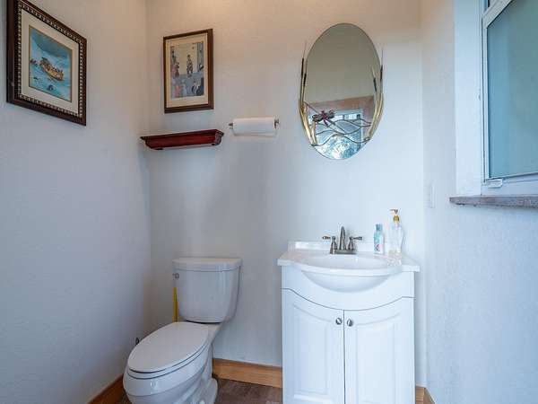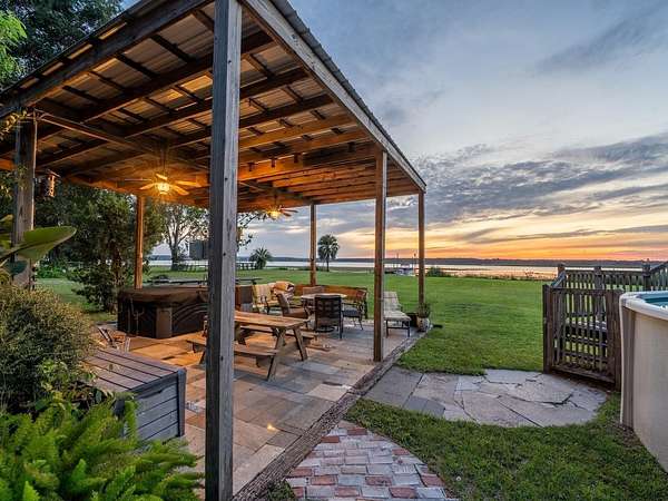The main home includes 3 bedrooms, 2 bathrooms, plus a half bath outside for lake and work days. With 1,761 sq ft under heat and air, the home features vaulted ceilings, abundant natural light, and an open floor plan. The custom kitchen includes cherry cabinets, granite countertops, double ovens, glass cooktop, double-drawer dishwasher, and large sink with bar area. The spacious primary suite (15'x19') includes a walk-in closet and en suite with tiled walk-in shower, vanity, and private toilet area. Guest bedrooms share a Jack & Jill bath with tiled tub/shower combo. A wood-burning fireplace anchors the living room with lake views, while French doors open to a rear covered porch, fire pit, and landscaped backyard. Additional features include a 24'x12' carport, laundry/utility room, and screened area off the living room.