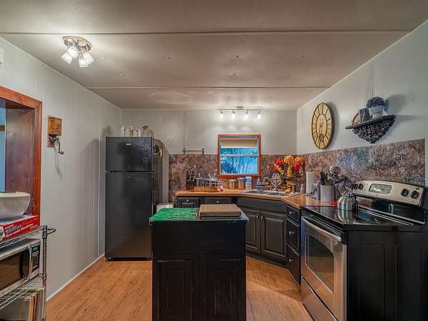 The guest home (1974 mobile home with full-length addition) offers 1,344 sq ft, 2 bedrooms, 2 bathrooms, dining area, updated kitchen with range, refrigerator, island, custom cabinets with wood countertops, and a 46'x12' living room with three large picture windows overlooking the lake. Several storage buildings are located between the two homes.