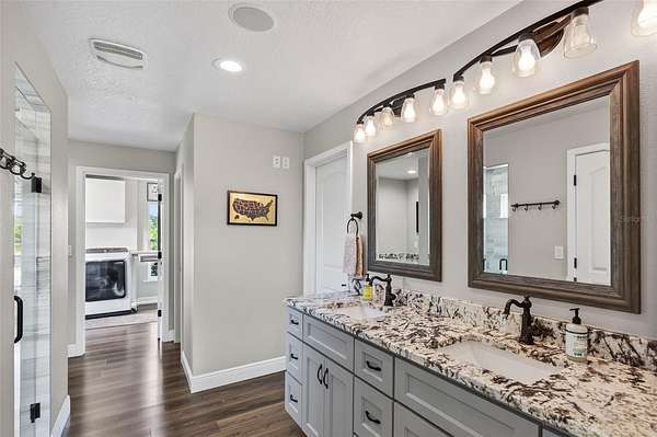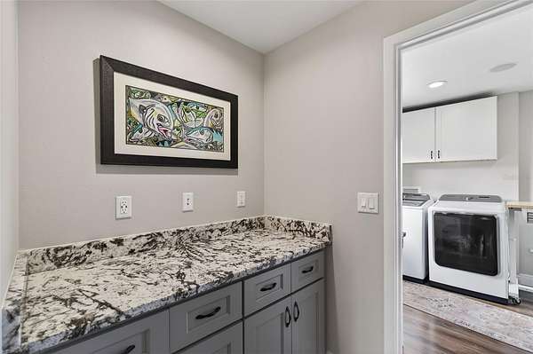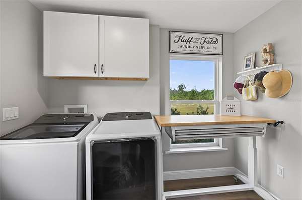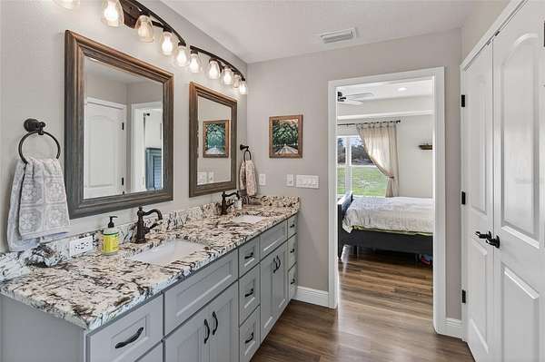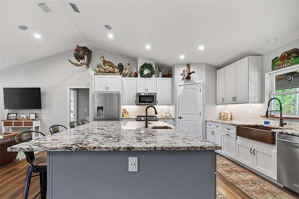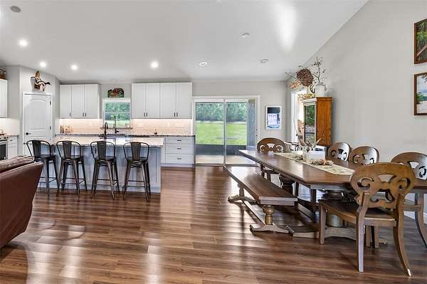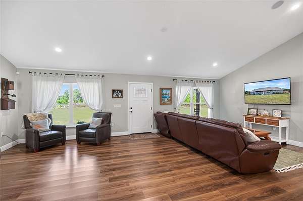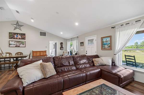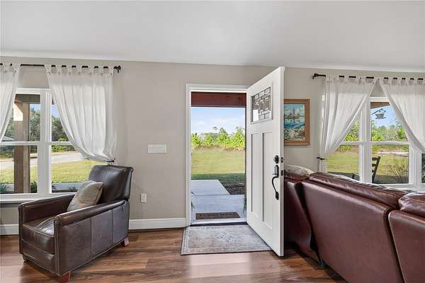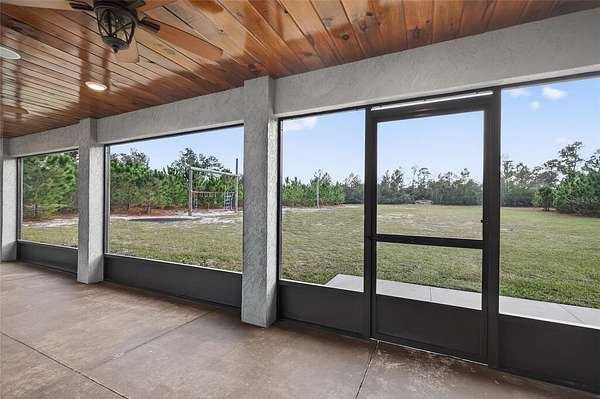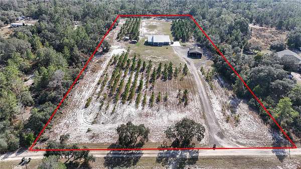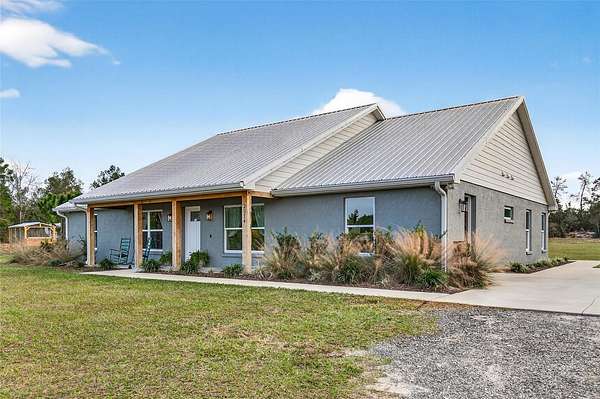Built in 2021, this meticulously maintained 3-bedroom, 2.5-bath residence reflects quality craftsmanship, intentional design, and a rustic yet elegant aesthetic throughout. The home is filled with abundant natural light, highlighting refined finishes and luxury vinyl plank flooring that flows seamlessly through the living spaces. Integrated surround sound supports both relaxed living and entertaining. The home is further enhanced by manicured landscaping, creating a polished and welcoming arrival. The kitchen is designed with both form and function in mind, featuring granite countertops, a substantial island with a prep sink, a copper main kitchen sink, under-cabinet lighting, and a walk-in pantry. A gas range anchors the space, with a 500-gallon propane tank supplying gas to both the stove and the tankless hot water heater, supporting efficiency and performance. Energy Star windows and a metal roof contribute to long-term durability and efficiency. The primary suite offers a private retreat, complete with a built-in Liberty safe and a thoughtfully designed ensuite featuring dual sinks with granite countertops, a walk-in shower, walk-in closet, private water closet, and custom built-in storage. An interior laundry room with utility sink adds convenience without sacrificing style. Outdoor living is equally refined. Both the front and rear porches feature stained tongue-and-groove ceilings, creating warm, inviting spaces. The 42x10 screened rear porch, accessed through sliding glass doors from the living area, extends the home's living space while overlooking the property. Sidewalks along the front and sides of the home and a dedicated grilling slab complete the exterior presentation. Set on 5 acres, the property offers privacy, space, and versatility, providing a blank canvas for future enhancements such as a pool, expanded outdoor living areas, or agricultural use including horses, cows, chickens, and more. A 30x27 workshop adds functional value for projects, equipment, or storage. The property backs up to the Lake Tracy Unit of the Seminole State Forest, offering a natural backdrop and an added sense of privacy. The location offers the best of Central Florida living. Situated near Lake Norris, with convenient access to Eustis and Mount Dora, the area is known for charming downtowns, waterfronts, dining, and cultural events. The nearby Wekiva River and the thousands of lakes throughout Lake County provide access to boating, kayaking, and nature trails. Central Florida's setting allows for efficient travel to surrounding communities, major roadways, area beaches, and world-class theme parks, blending peaceful surroundings with regional accessibility.