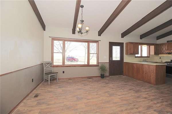 Surround yourself with nature and wildlife! Enjoy fishing in your very own stocked pond which is about 1 acre m/l. Beautiful stone on front of home and metal siding on the other sides are only 2 years old. Inside, you will find vaulted ceilings with wood beams in the living room/kitchen/dining area. Kitchen cabinets have pullouts. Some NEWER flooring. Some fresh paint. Some NEW lighting. Flue for wood stove in basement. Metal roof is about 4 years old. Watch the sunsets from your deck with outdoor fireplace. Attached 2-car garage is 690 square feet and has a NEWER garage door. 960 square foot garage was built in 1996, has an overhead door and a sliding door, has a concrete floor, has electric and has spray foam insulation on the walls. 192 square foot shed. Plenty of room for a large garden. Bring your animals! Located close to a blacktop road.
