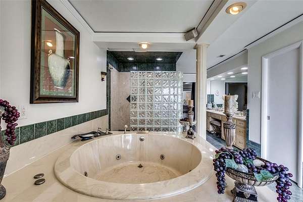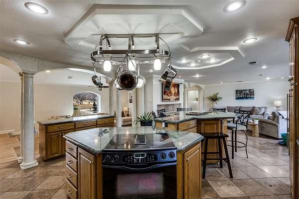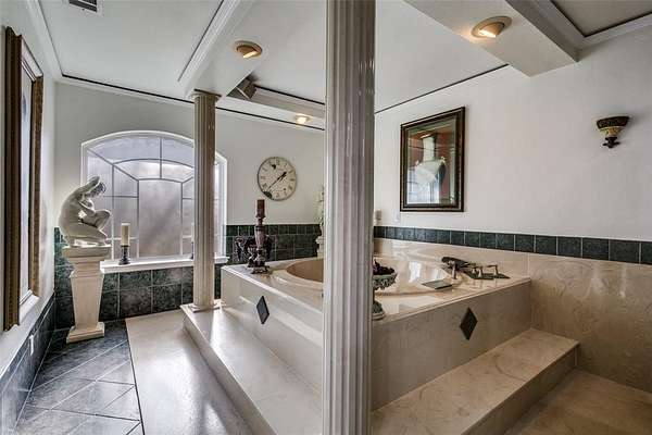 Interior features include walnut travertine floors, marble columns, arched details, and large scenic windows that bring in natural light and frame views of mature trees and the private garden and pond. The open main level provides generous living and dining spaces that connect easily to the kitchen, making entertaining and daily living seamless. Multiple living areas offer separation for media, lounging, and hosting.