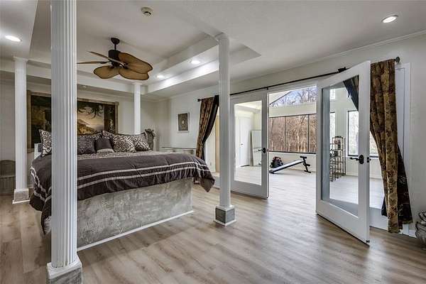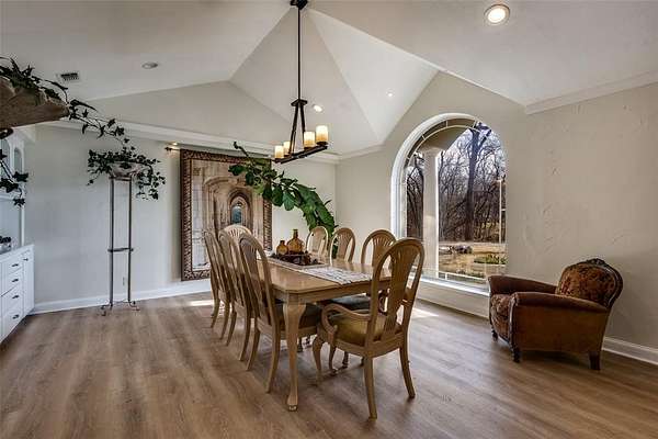 Tuscan inspired Alton Cox custom built estate on 7 wooded acres offering exceptional privacy, views, and flexible living space. This brick home features 7 bedrooms, 6 full baths, 3 living areas, 4 car garage, circular drive, daylight basement, and well-planned split-level design ideal for multigenerational living or guests. Approx. 5,000 SF.