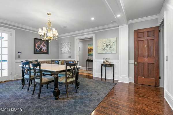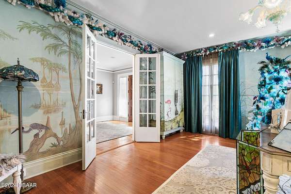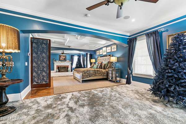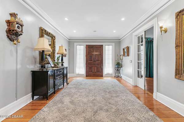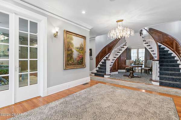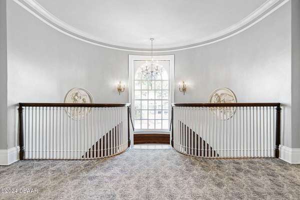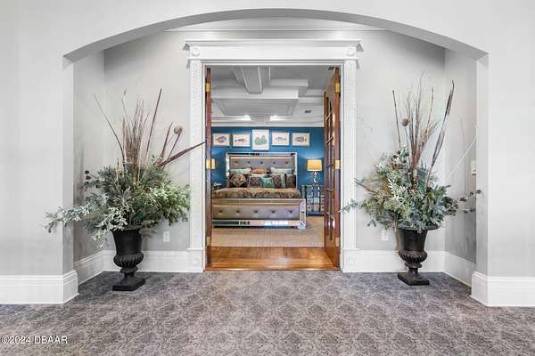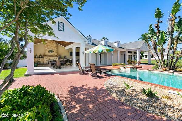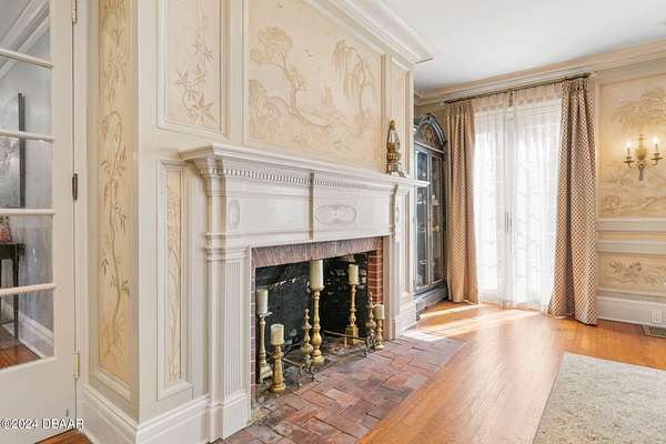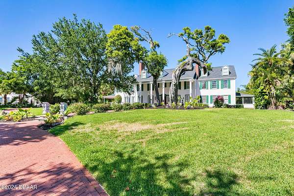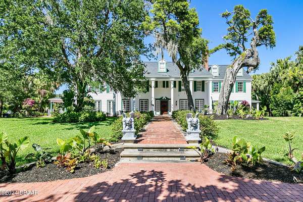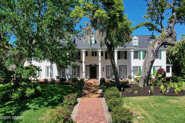 Behold the stately residence, Rowallan. Built in 1913 on 1.63 acres of lush gardens, it sits across from the Intercoastal Waterway, just a short walk to the Atlantic Ocean. The home has been carefully and lovingly cared for through the years, maintaining the integrity of the original design and construction. The interior has been updated to today's luxury standards and creature comforts, painstakingly coordinating with the unique design of that era. You will appreciate the beauty of five original fireplaces, the 6 spacious bedrooms, 6 vintage baths and 2 half baths. An impressive double door entry opens to a foyer with a grand, double staircase. You'll travel back in time, enveloped in beautifully detailed crown molding, wainscoting, carved fireplaces and the grandeur that is Rowallan. Among the many unique features of this coveted historic estate, which is on the National Historic Registry, are the preserved wall murals by the famed artist, Jay Postle, and the original heart pine wood floors in the parlor, library, formal dining room, and downstairs bedroom. The upstairs primary suite is an expansive, comfortable retreat, (54 x 17) boasting two sitting areas, 2 fireplaces, a changing room and an oversized, fully customized, walk-in closet. The en suite features a vintage design, representative of the era, in a beautiful black and white marble palette. The remaining 5 bedroom suites are spacious and welcoming, each with a coordinating vintage bath. On the 3rd floor is a 1,750 sq. ft. finished & air conditioned attic with a half bath, which could be used as a game room, theater, or gym. The original kitchen has been remodeled - updated with modern appliances and finishes. The Butler's Pantry provides additional storage space with additional food preparation work space for large parties. A casual kitchen dining area, or morning room, provides expansive views of the gardens, patios, pool & spa, cabana, and the lush, gated grounds. A large lanai offers shaded outdoor entertainment space, with a fireplace and wet bar. The cabana is inviting with a kitchenette and bath which could be used as a private guest house or mother-in-law suite, and has access to the open air pool and spa. The pool features a large deck, perfect for holding large gatherings of family and friends. Access to this coveted private estate is through two gated entryways on John Anderson Drive or through private gated entrance on Landmark Circle. The residence is centrally located near downtown Ormond dining and shopping, riverfront parks, the prestigious Oceanside Country Club, and a just a short walk to the Atlantic Ocean. This one-of-a kind, historic estate offers a lifestyle reminiscent of a bygone era, of laughter and joy, abundance, and gracious living. Don't miss this rare opportunity to own a historic masterpiece. Once you view it, you'll want to make it your own! All information is intended to be correct but is not warranted. Buyer should exercise due diligence. All buyers are encouraged conduct a home inspection before purchasing a home.