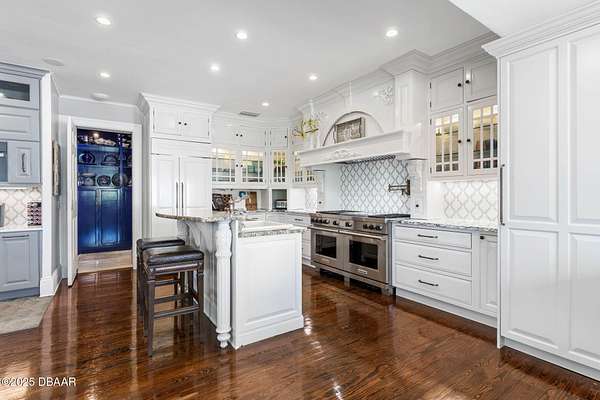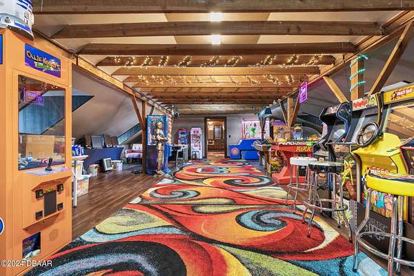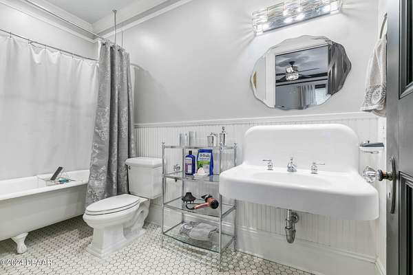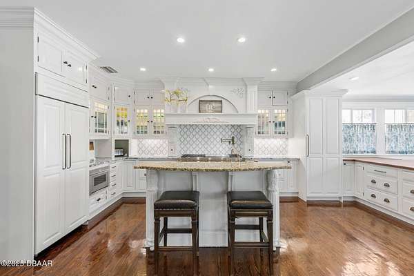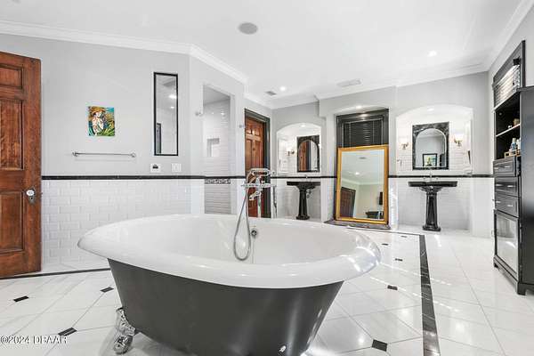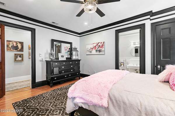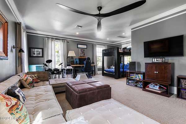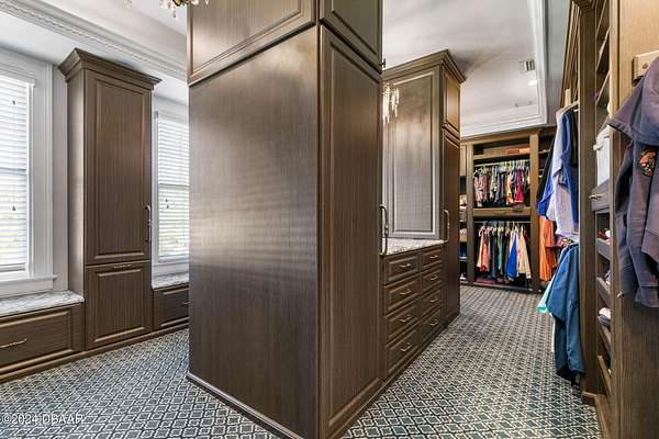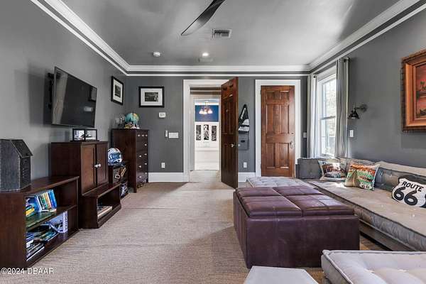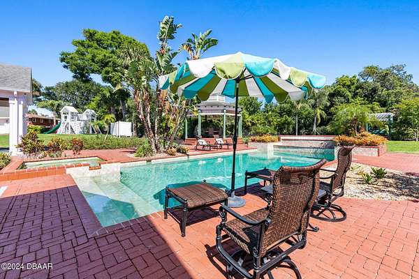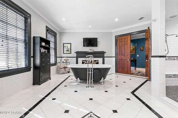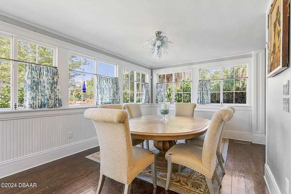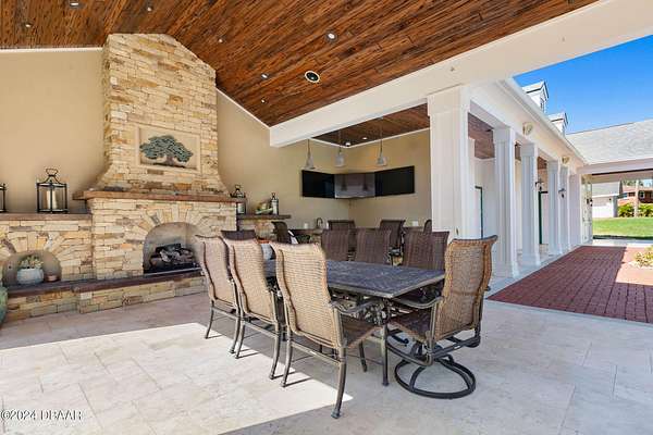 Behold the stately residence, Rowallan. Built in 1913 on 1.63 acres of lush gardens, it sits across from the Intercoastal Waterway, just a short walk to the Atlantic Ocean. The home has been carefully and lovingly cared for through the years, maintaining the integrity of the original design and construction. The interior has been updated to today's luxury standards and creature comforts, painstakingly coordinating with the unique design of that era. You will appreciate the beauty of five original fireplaces, the 6 spacious bedrooms, 6 vintage baths and 2 half baths. An impressive double door entry opens to a foyer with a grand, double staircase. You'll travel back in time, enveloped in beautifully detailed crown molding, wainscoting, carved fireplaces and the grandeur that is Rowallan. Among the many unique features of this coveted historic estate, which is on the National Historic Registry, are the preserved wall murals by the famed artist, Jay Postle, and the original heart pine wood floors in the parlor, library, formal dining room, and downstairs bedroom. The upstairs primary suite is an expansive, comfortable retreat, (54 x 17) boasting two sitting areas, 2 fireplaces, a changing room and an oversized, fully customized, walk-in closet. The en suite features a vintage design, representative of the era, in a beautiful black and white marble palette. The remaining 5 bedroom suites are spacious and welcoming, each with a coordinating vintage bath. On the 3rd floor is a 1,750 sq. ft. finished & air conditioned attic with a half bath, which could be used as a game room, theater, or gym. The original kitchen has been remodeled - updated with modern appliances and finishes. The Butler's Pantry provides additional storage space with additional food preparation work space for large parties. A casual kitchen dining area, or morning room, provides expansive views of the gardens, patios, pool & spa, cabana, and the lush, gated grounds. A large lanai offers shaded outdoor entertainment space, with a fireplace and wet bar. The cabana is inviting with a kitchenette and bath which could be used as a private guest house or mother-in-law suite, and has access to the open air pool and spa. The pool features a large deck, perfect for holding large gatherings of family and friends. Access to this coveted private estate is through two gated entryways on John Anderson Drive or through private gated entrance on Landmark Circle. The residence is centrally located near downtown Ormond dining and shopping, riverfront parks, the prestigious Oceanside Country Club, and a just a short walk to the Atlantic Ocean. This one-of-a kind, historic estate offers a lifestyle reminiscent of a bygone era, of laughter and joy, abundance, and gracious living. Don't miss this rare opportunity to own a historic masterpiece. Once you view it, you'll want to make it your own! All information is intended to be correct but is not warranted. Buyer should exercise due diligence. All buyers are encouraged conduct a home inspection before purchasing a home.