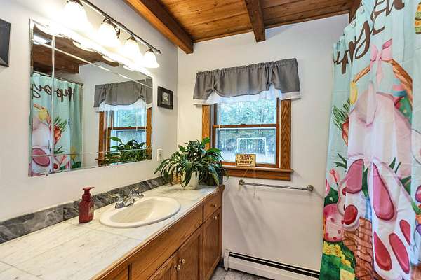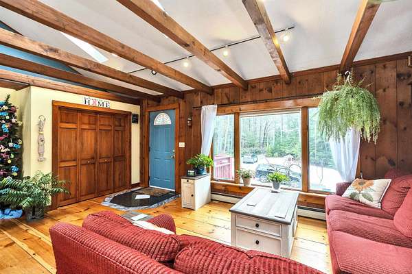 Beautifully maintained log ranch set at the end of a long, rhododendron lined driveway. The secluded yard is bordered by a brook on the left side of the property. Inside the living area boasts an open floor plan with a beamed vaulted ceiling and wide pine flooring. The spacious kitchen is a cook's delight with cherry cabinets, granite countertops, and a soapstone baking station. The cozy primary bedroom has a newly renovated bathroom. The full hall bath has marble flooring and a jetted tub. Basement area has a finished bonus room that is ideal as an office or playroom, plus a laundry area. Walkout to the heated 2 bay garage. The home has a standby generator and mini-splits for heating/cooling. This home has been well maintained and updated. Open house Sunday, March 29th from 1-3 pm. Don't miss this one!