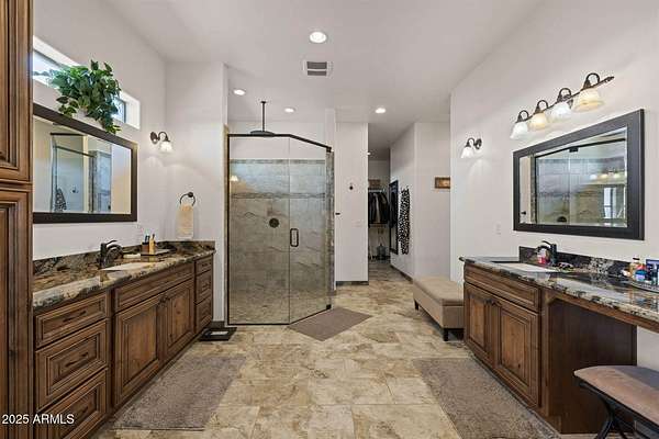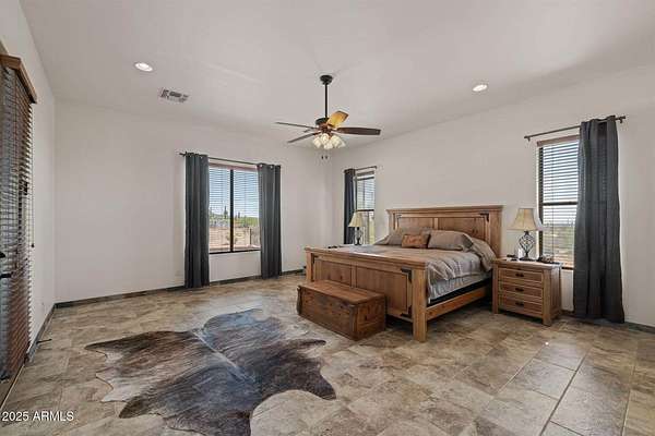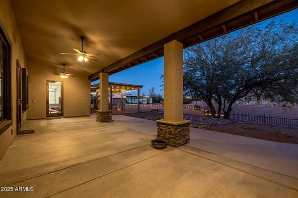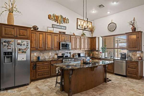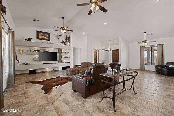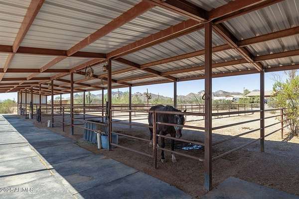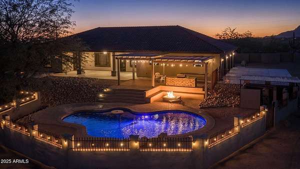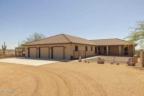 Stunning views from this 7.5 acre horse property, perfectly designed for the equine lifestyle. This 2014 custom built gem boasts an open concept greatroom, gorgeous kitchen featuring granite countertops, a massive island, farm sink & walk in pantry. Step outside to your private oasis with a sparkling pool featuring a waterfall, cocktail table & auto cleaning system. The built-in Traeger BBQ area with granite bar offers an ideal space for grilling poolside or entertaining. Enjoy serene evenings by the propane fire pit next to the pool or the sitting area on the back patio with a wood-burning fire pit, perfect for relaxing under the stars. Equestrian facilities include a 150x220 arena with remote controlled roping chutes, 7 covered stalls, 12x13 tack room & generous covered hay storage. Attached 3 car garage with water softener & work benches is extended length & width. Detached 7 stall storage/garage has 2 fully enclosed bays & 5 open bays. For added convenience and peace of mind, the property features a remote access gate & security screen doors. The private well is protected by it's own well house & the pool equipment is shaded from the outside elements as well. Two RV hookups with accompanying dump stations plus ample parking. Washer/Dryer set just purchased in July 2025. Embrace the ultimate blend of luxury and functionality in a picturesque setting tailored for both relaxation and recreation. Welcome home!