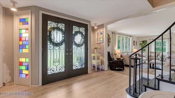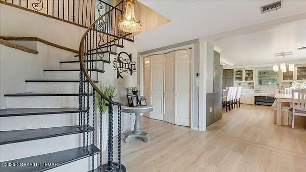 BACK ON THE MARKET - BUYERS FAILED TO PERFORM. Home appraised above listed price and inspections completed. Set on nearly 4 private acres in the beautiful Mahoning Valley, this 3,600 sq ft home offers space, comfort, and exceptional views. Designed for both everyday living and effortless entertaining, the main level features an open floor plan, generous natural light, and multiple gathering areas. A grand two-story foyer with double doors and a striking helical staircase sets the tone. The spacious kitchen offers a center island, custom pantry storage, and extensive cabinetry, open to the living areas with sweeping valley scenery. A cozy adjoining family room with a fireplace provides a perfect place to unwind. The first floor also includes a guest bedroom, full bath, and oversized laundry room. Upstairs, the expansive primary suite serves as a private retreat with an attached office or nursery, full bath, and four closets. Three additional bedrooms and full bath offer flexibility for family or guests. The finished lower level adds even more living space with a second family room and two bonus rooms ideal for guests, hobbies, or home offices. Additional highlights include central air, a breezeway leading to the 2-car garage, and a long paved driveway that positions the home well back from the road for peace and privacy. Seller is relocating and ready for a smooth, quick closing. A rare opportunity to secure a spacious home in a sought-after setting.