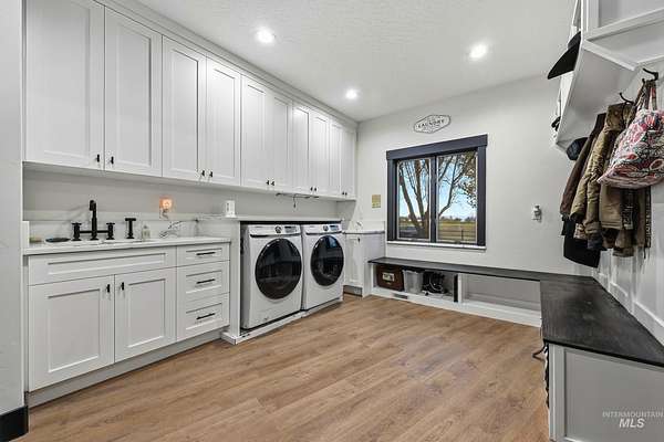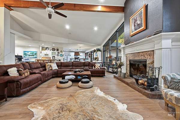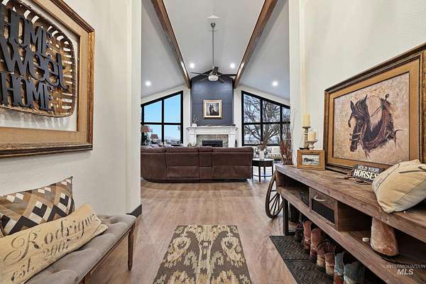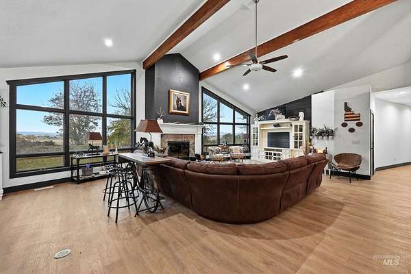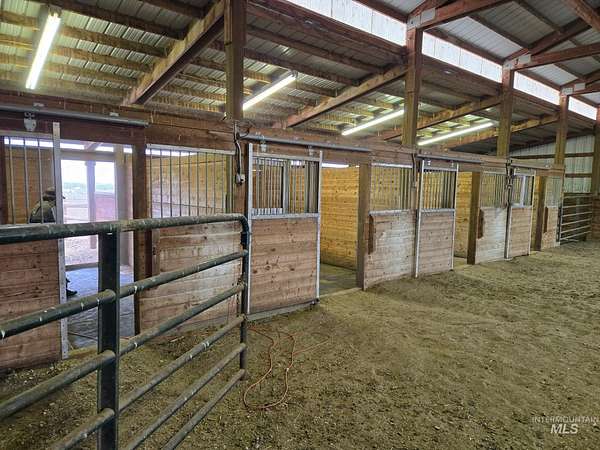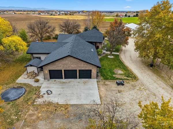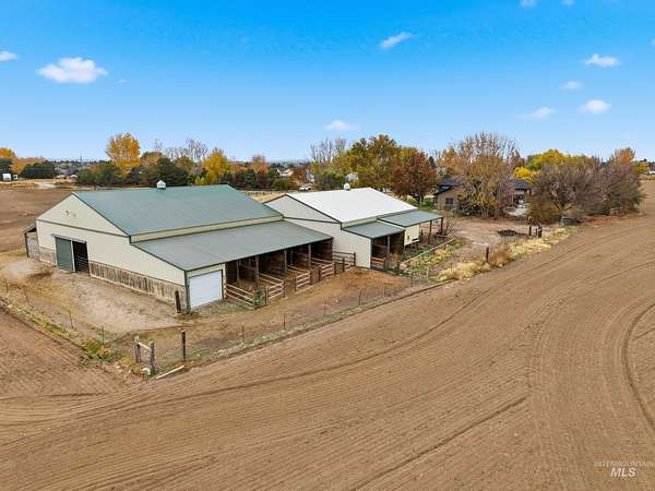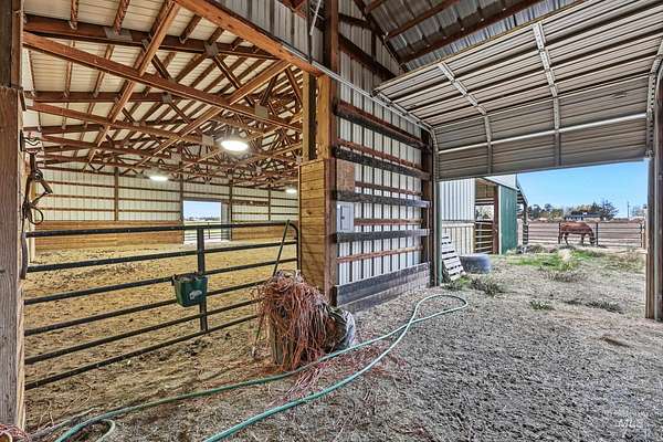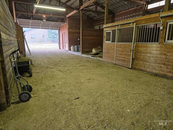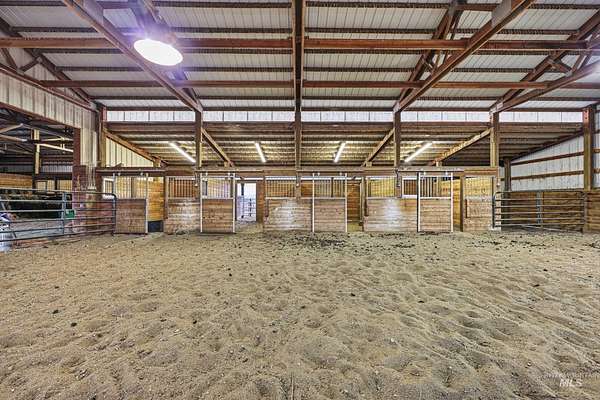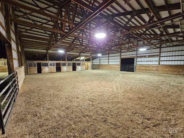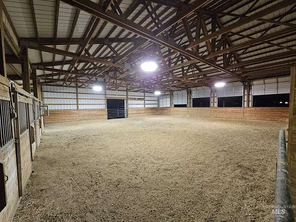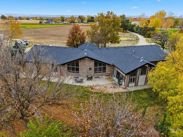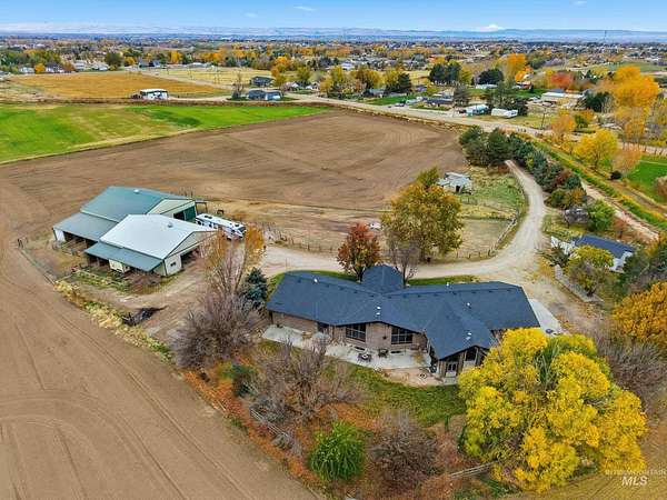 Enjoy vast skies & amazing views on this equestrian ranchette w/60x60 indoor riding arena, all the supporting tack rooms, 6 stables, 2 Barns & Chicken Coop! This beautiful & enormous remodeled home includes newer hardwood-style floors, plush pattern carpet, vaulted ceiling with pine with Cherry Fireplace, Updated Kitchen, Master Suite/Bathroom and all bathrooms. One of a kind horse property with 5721 square foot all brick home with view of the Boise front hills. Second Home-ADU Compliance and high end finishes that is additional 600 sq ft with large Living Room, Kitchen and Second Master suite. Features: dedicated 30amp and 50amp power plugs for RV. EV charging port in garage, completely wired for cat5e ethernet through the house, barn, and ADU. The ADU has fiber optic line from main house to provide internet connectivity so everything is interconnected. Barn Features include Wash Bay with electric Water heater and a Bar-Bar-A antifreeze automatic waterer for horses or whatever animal you would like. Provides 100% hands off for watering animals so no more busting up frozen water in the winter months. The House has a New roof, new facia, new gutters and matching LVP flooring for the basement plus water softener and reverse osmosis system. Piped for Irrigation in pasture. Buyer / Buyer's agent to verify with School District for current schools/school boundaries. BTVAI