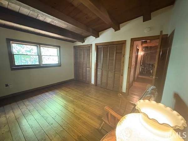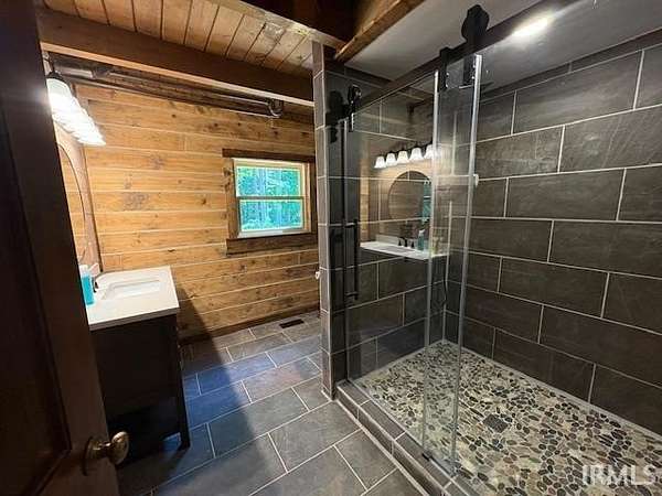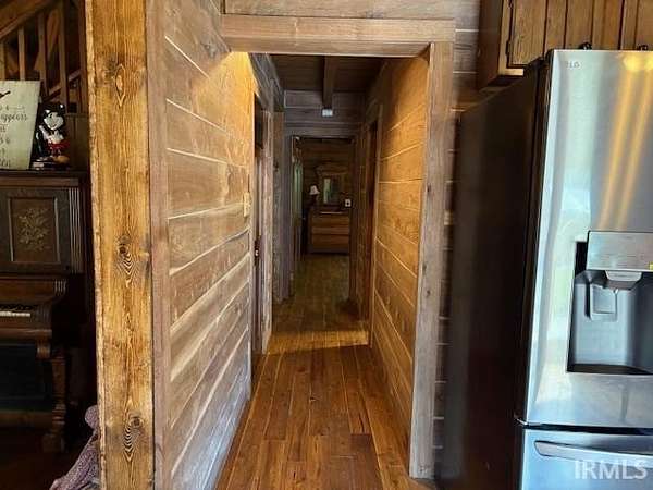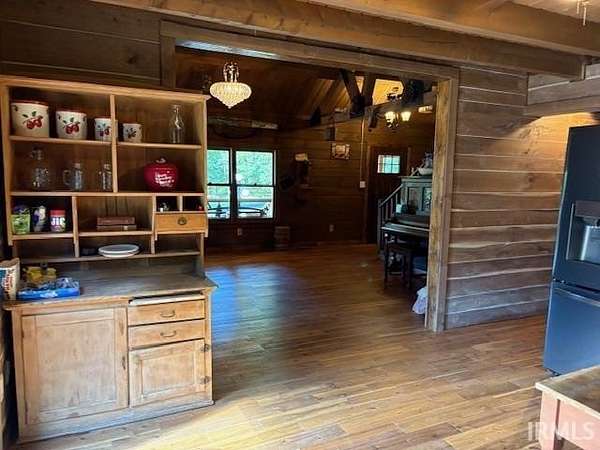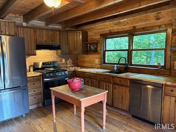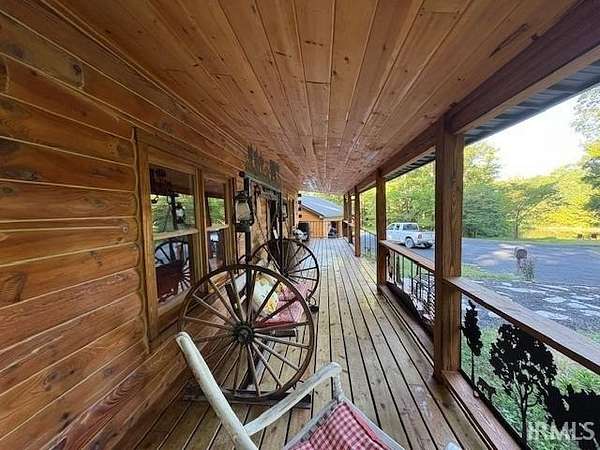 This beautiful 3BR 2BA log home is the retreat you been waiting for to call home! Sit on your 8x42 covered front deck overlooking your stocked pond. Deck has original designs on rails. 34+/- wooded acres in classified forest with a running creek and plenty of deer and wildlife. Walk into this open rustic cabin with huge living room and formal dining room with chandelier. Country kitchen with new LG Black Stainless Steel appliances. Primary bedroom is large size and the closet space in all bedrooms are great. Hardwood floors thru out. Stunning new walk-in shower on mail level and new bathroom cabinetry. Upstairs is an open loft with 2 bedrooms and a bathroom with charming cast iron tub. Basement has the room for a recreation area or hang out. 2C-detached garage with a lean-to and 36x54x12 pole barn for all your toys or hobbies. 16x32 shelter house to entertain or use for more storage. Black top driveway. Reelsville Water. Located just off I-70/Putnamville Exit for good commute. Only 10 minutes from Cataract Lake.