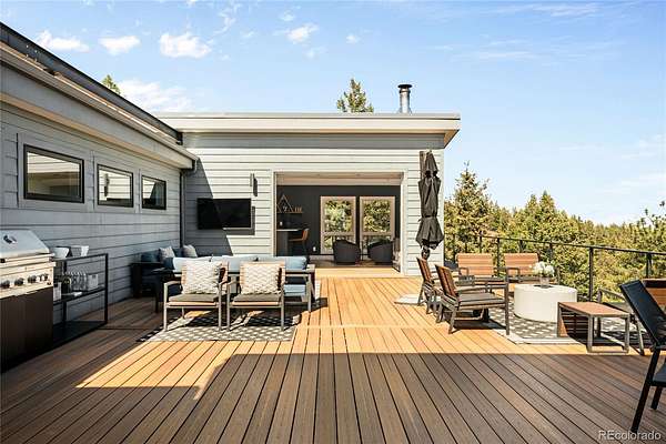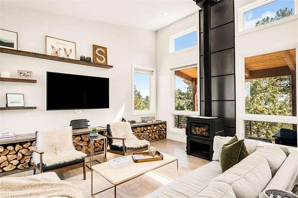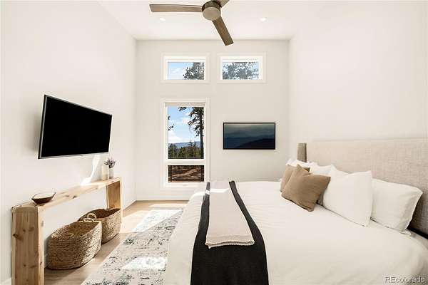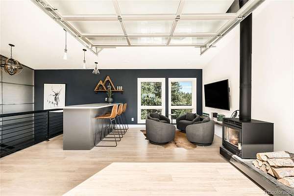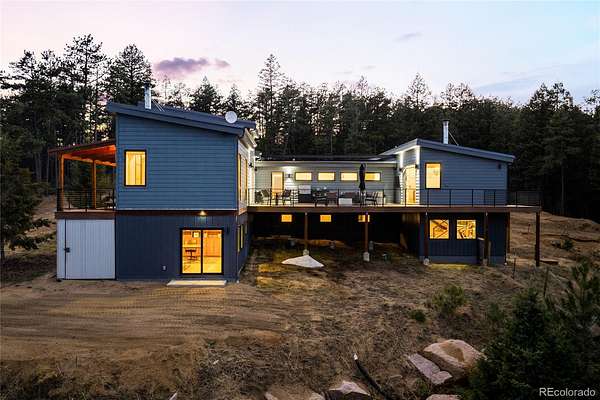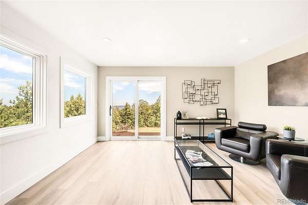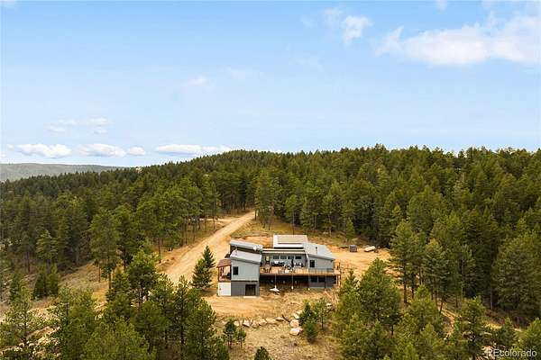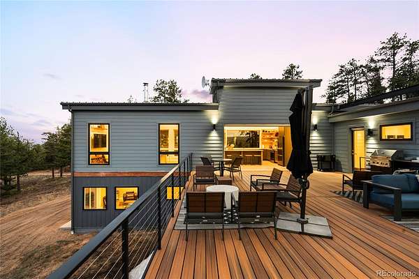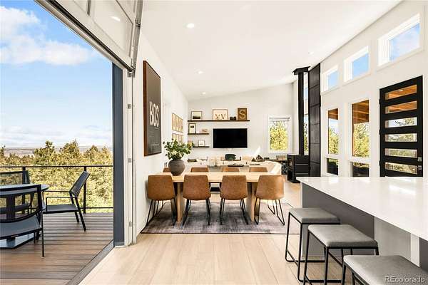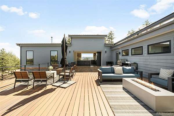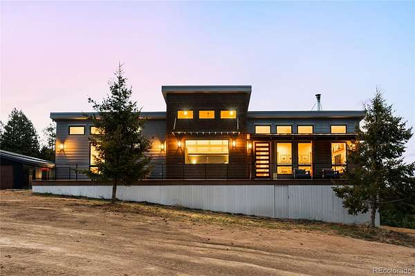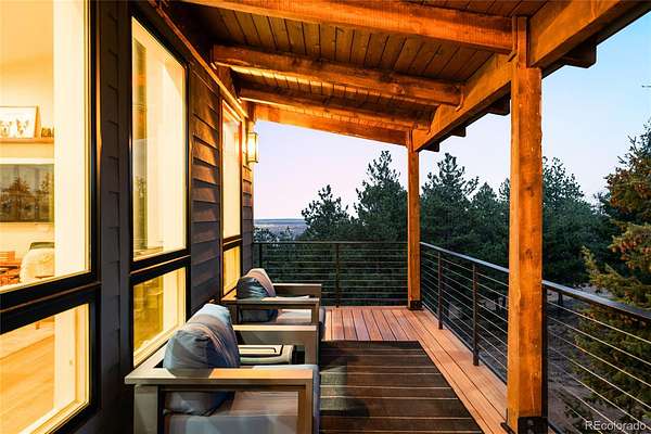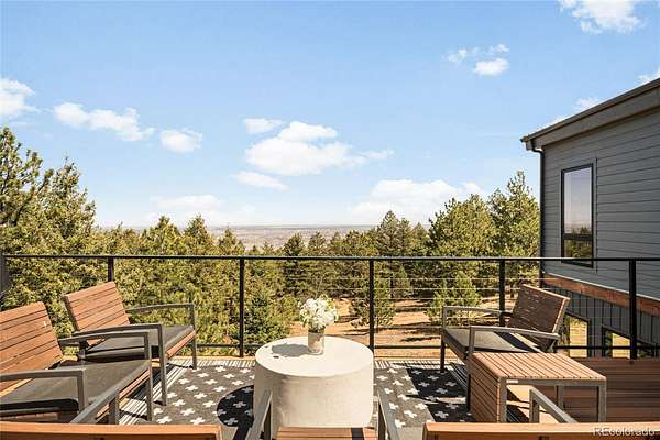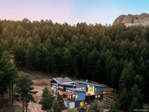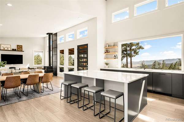 Grounded in sustainability and impeccable architectural design, this extraordinary Enchantment escape is framed by panoramic views of Pikes Peak. Set on a tranquil, secluded homesite, this ranch offers nearly 5,000 square feet of thoughtfully designed living space with an emphasis on energy efficiency and effortless indoor-outdoor living. Soaring 16-foot ceilings elevate the chef’s kitchen, while commercial-grade glass garage doors open to expansive outdoor areas. The primary suite is a true sanctuary, featuring dual walk-in closets, a cozy fireplace, and a spa-inspired five-piece bath. The main level also includes two additional bedrooms, a versatile mudroom, and a den with a bar, while the walkout lower level offers a gym, bunk room, office, and abundant storage. Designed for sustainable living, this home features radiant floor heating, solar power, Energy Star smart appliances, and well water for near-zero utility costs. A composite deck, durable steel and concrete siding, and a detached three-car garage complete this one-of-a-kind Colorado retreat.