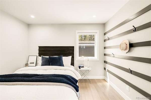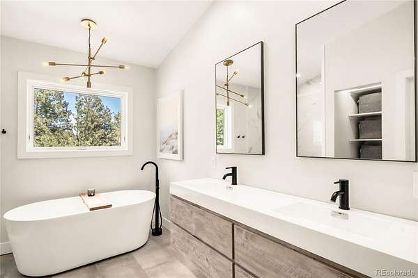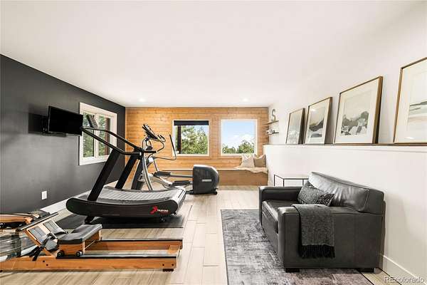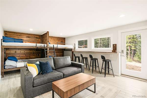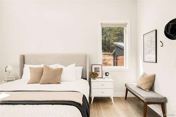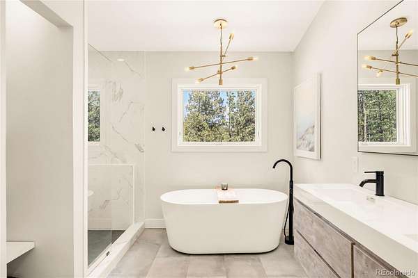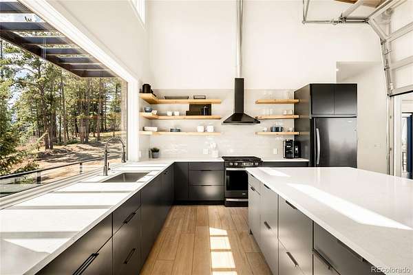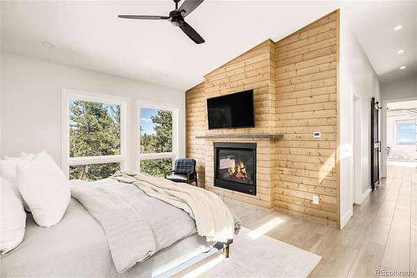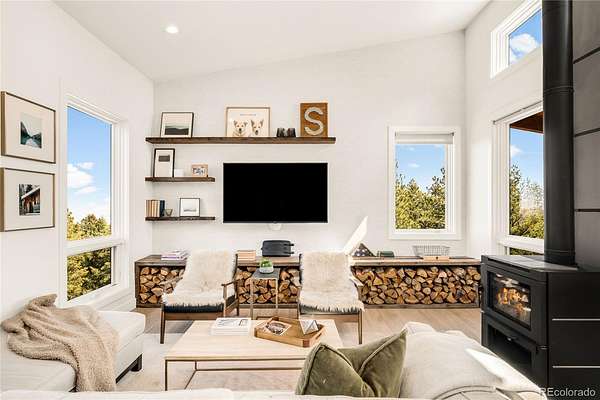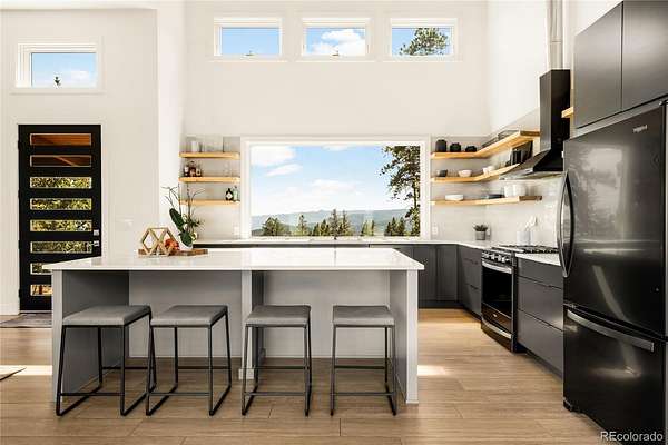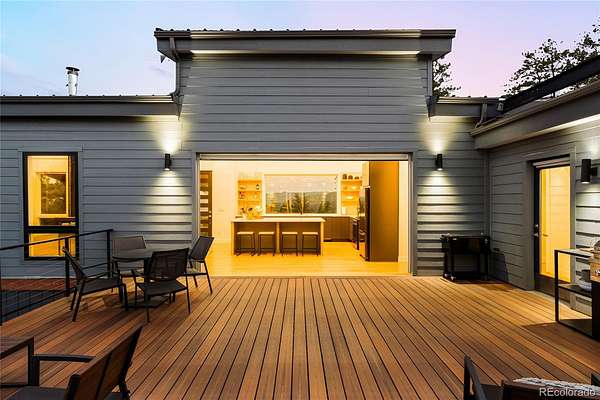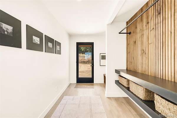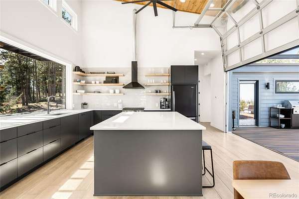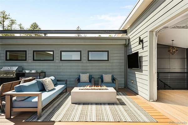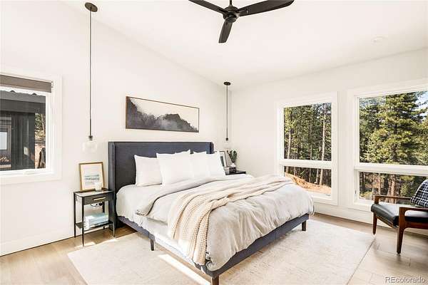 Grounded in sustainability and impeccable architectural design, this extraordinary Enchantment escape is framed by panoramic views of Pikes Peak. Set on a tranquil, secluded homesite, this ranch offers nearly 5,000 square feet of thoughtfully designed living space with an emphasis on energy efficiency and effortless indoor-outdoor living. Soaring 16-foot ceilings elevate the chef’s kitchen, while commercial-grade glass garage doors open to expansive outdoor areas. The primary suite is a true sanctuary, featuring dual walk-in closets, a cozy fireplace, and a spa-inspired five-piece bath. The main level also includes two additional bedrooms, a versatile mudroom, and a den with a bar, while the walkout lower level offers a gym, bunk room, office, and abundant storage. Designed for sustainable living, this home features radiant floor heating, solar power, Energy Star smart appliances, and well water for near-zero utility costs. A composite deck, durable steel and concrete siding, and a detached three-car garage complete this one-of-a-kind Colorado retreat.