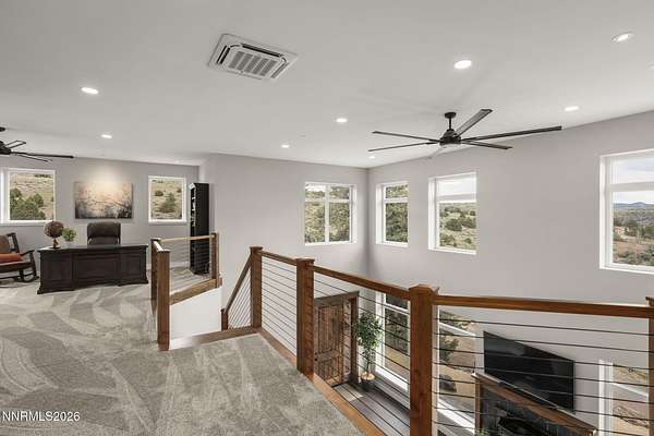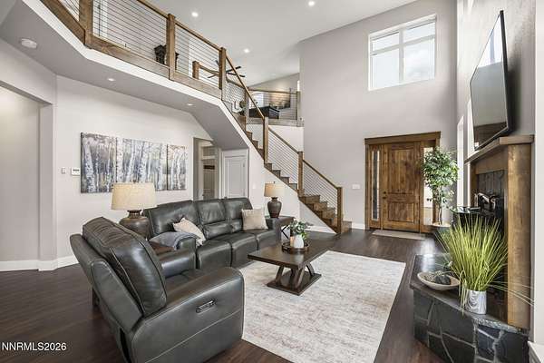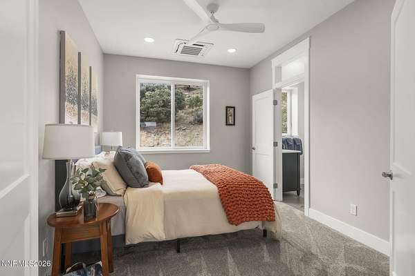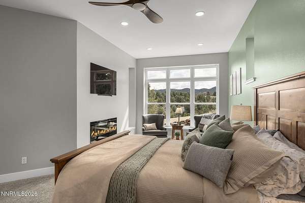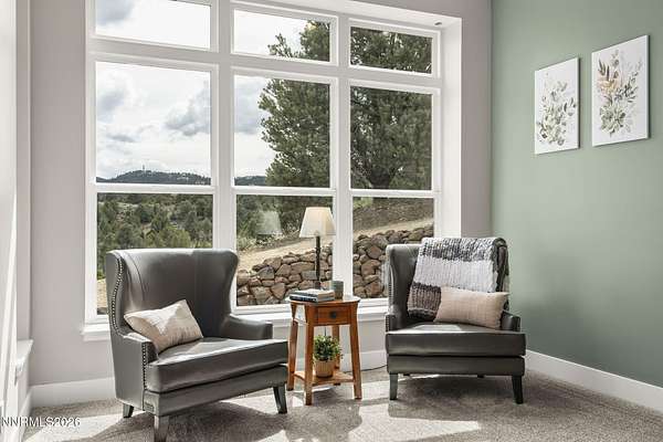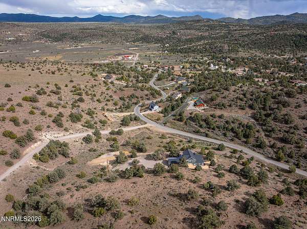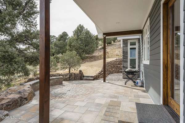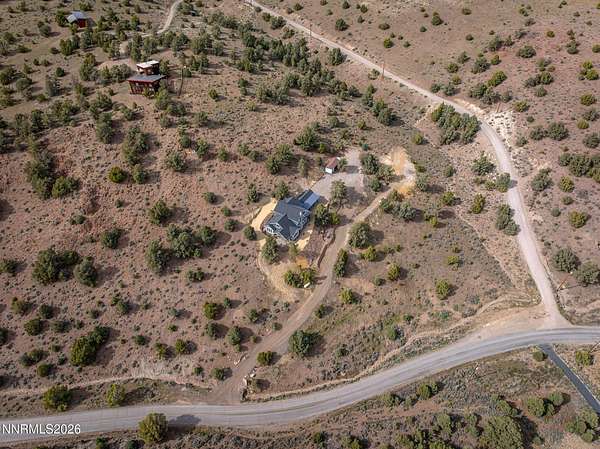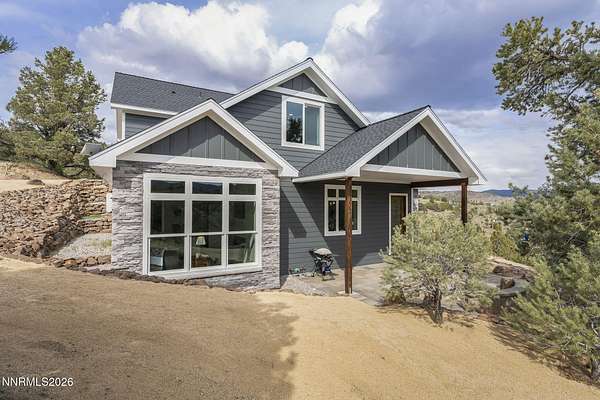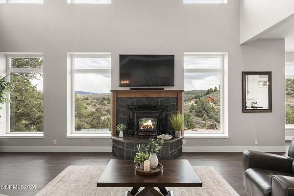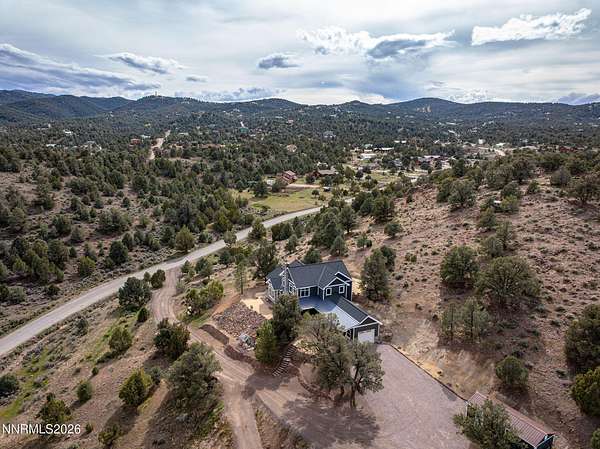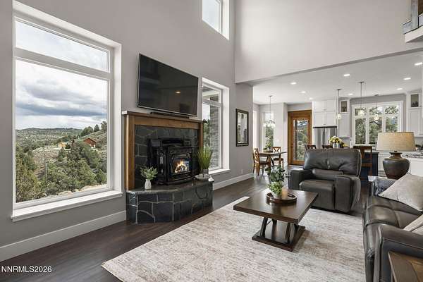 Live the ultimate Northern Nevada lifestyle in this stunning Virginia City Highlands retreat, complete with adjacent parcel (#003-032-01) totaling 4.1 acres, included with power already in place for future build options. Set on a paved street, this property offers privacy, sweeping views, room for horses and a peaceful setting surrounded by wildlife-yet just 20 minutes from South Reno shopping and restaurants, and 15 minutes from historic Virginia City. Built with insulated concrete forms (ICF), this high-performance home is energy-efficient, durable, and fire-resistant. The interior showcases tall ceilings, an open great room with pellet stove, LVP flooring, expansive windows capturing stunning views, and a beautiful alder wood staircase. The kitchen features a concrete island with prep sink and built-in microwave, KitchenAid appliances, farmhouse sink, walk-in pantry with additional refrigerator, and soft-close cabinetry with pull-outs including a spice drawer. Enter through the double doors into the main-level primary suite which includes an electric fireplace, cedar-lined closet with built-ins, and access to a hidden walk-in safe room. The spa-inspired bathroom offers dual vanities, LED mirrors, a smart walk-in shower with pebble floor and tile surround, plus a Toto toilet with bidet. Upstairs offers two additional bedrooms and an office/den that could easily convert to a fourth bedroom, along with generous drop-down attic storage. Additional highlights include a large laundry room with sink and cabinetry, LED lighting throughout, lifetime warranty Milgard windows, ceiling fans in every room, and mini-split HVAC systems in each room. The finished garage includes crawl space storage above the entire garage, on demand hot water heater and water filtration system. The property is fully equipped for a rural lifestyle with RV parking (two spots with full hookups), room for horses and toys, a 12x20 insulated workshop with heat, water, and sewer, generator hookup for main home with transfer switch, greenhouse with irrigation timer, and a spacious patio stubbed for firepit and BBQ. A rare opportunity, this stunning home and property must be seen to be fully appreciated.