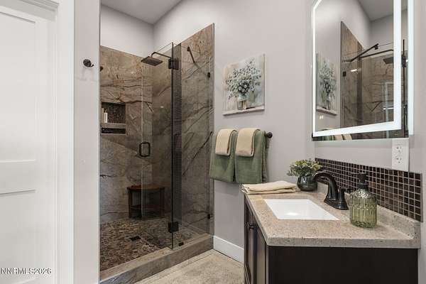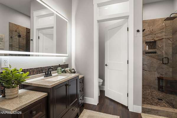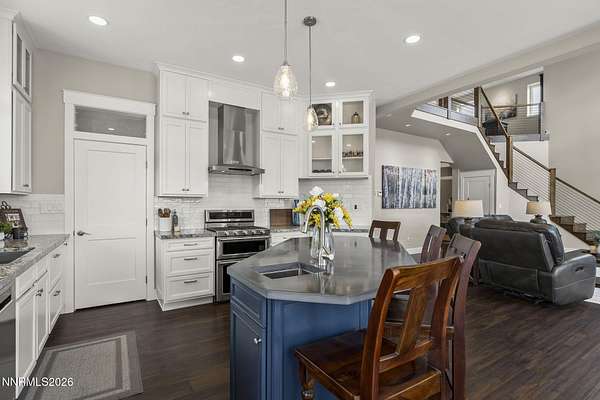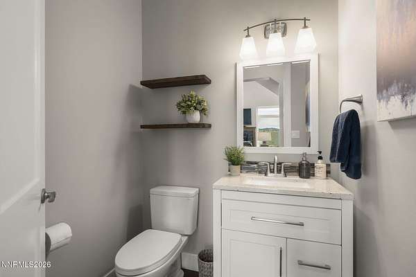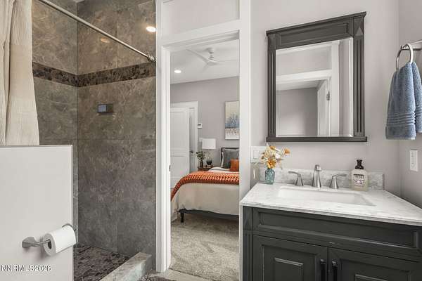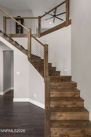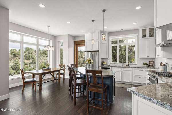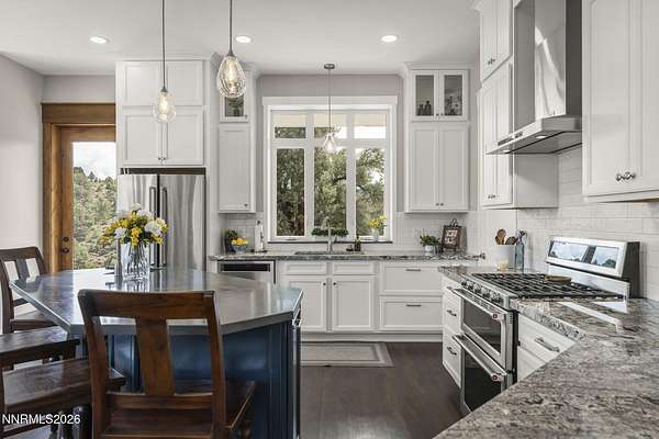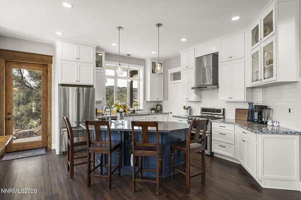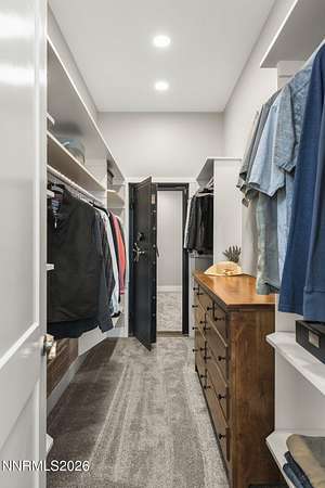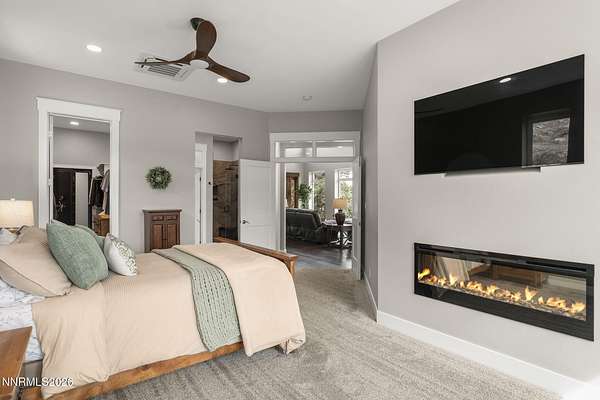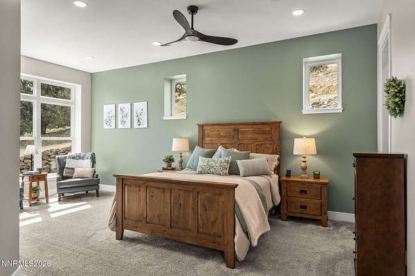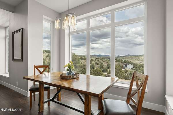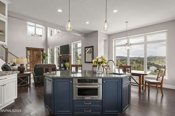 Live the ultimate Northern Nevada lifestyle in this stunning Virginia City Highlands retreat, complete with adjacent parcel (#003-032-01) totaling 4.1 acres, included with power already in place for future build options. Set on a paved street, this property offers privacy, sweeping views, room for horses and a peaceful setting surrounded by wildlife-yet just 20 minutes from South Reno shopping and restaurants, and 15 minutes from historic Virginia City. Built with insulated concrete forms (ICF), this high-performance home is energy-efficient, durable, and fire-resistant. The interior showcases tall ceilings, an open great room with pellet stove, LVP flooring, expansive windows capturing stunning views, and a beautiful alder wood staircase. The kitchen features a concrete island with prep sink and built-in microwave, KitchenAid appliances, farmhouse sink, walk-in pantry with additional refrigerator, and soft-close cabinetry with pull-outs including a spice drawer. Enter through the double doors into the main-level primary suite which includes an electric fireplace, cedar-lined closet with built-ins, and access to a hidden walk-in safe room. The spa-inspired bathroom offers dual vanities, LED mirrors, a smart walk-in shower with pebble floor and tile surround, plus a Toto toilet with bidet. Upstairs offers two additional bedrooms and an office/den that could easily convert to a fourth bedroom, along with generous drop-down attic storage. Additional highlights include a large laundry room with sink and cabinetry, LED lighting throughout, lifetime warranty Milgard windows, ceiling fans in every room, and mini-split HVAC systems in each room. The finished garage includes crawl space storage above the entire garage, on demand hot water heater and water filtration system. The property is fully equipped for a rural lifestyle with RV parking (two spots with full hookups), room for horses and toys, a 12x20 insulated workshop with heat, water, and sewer, generator hookup for main home with transfer switch, greenhouse with irrigation timer, and a spacious patio stubbed for firepit and BBQ. A rare opportunity, this stunning home and property must be seen to be fully appreciated.