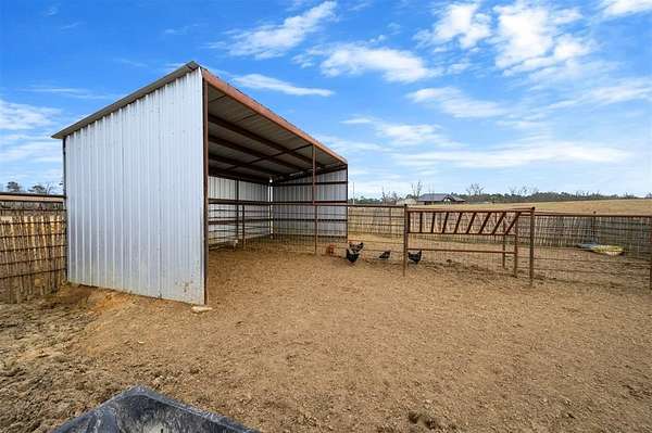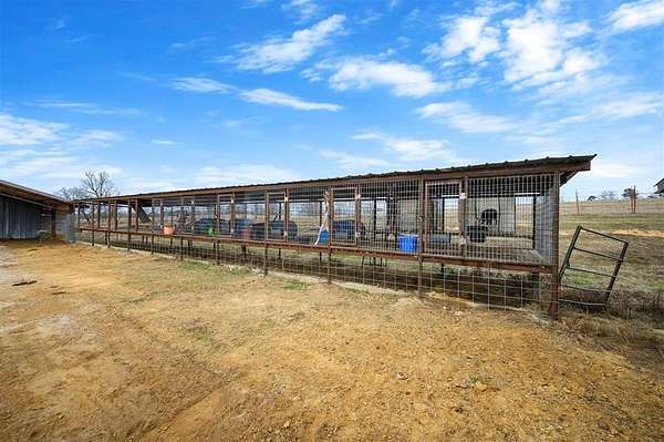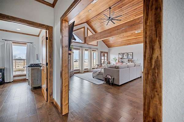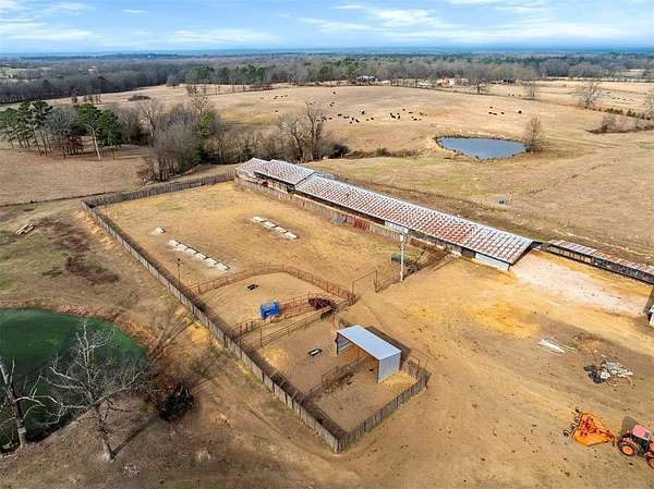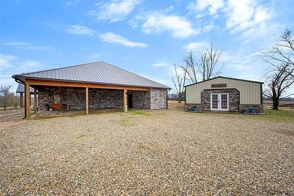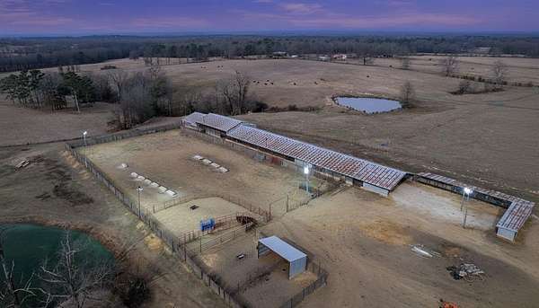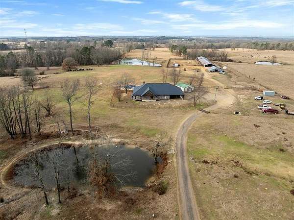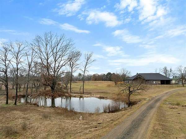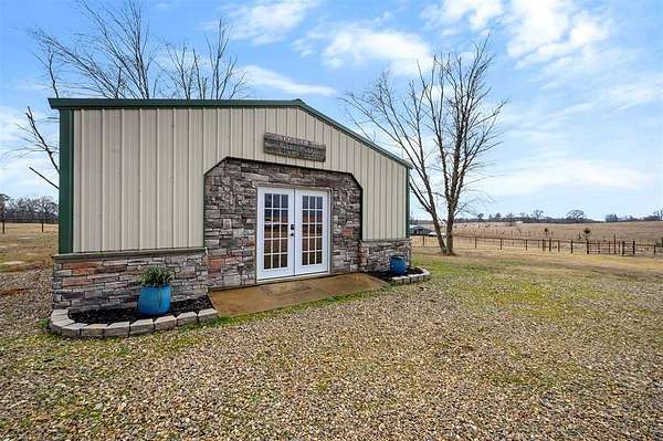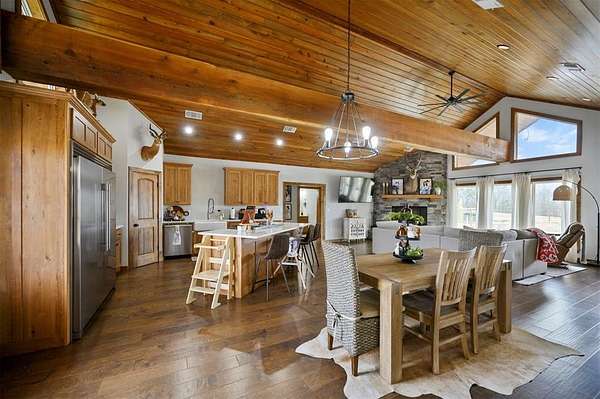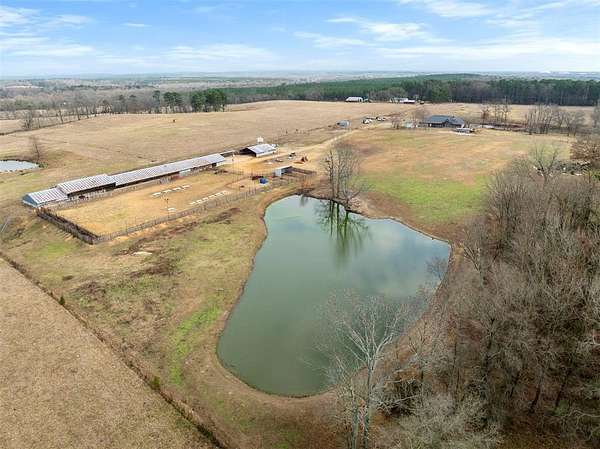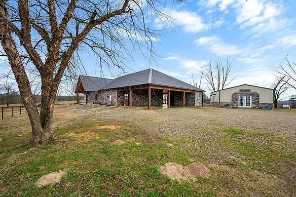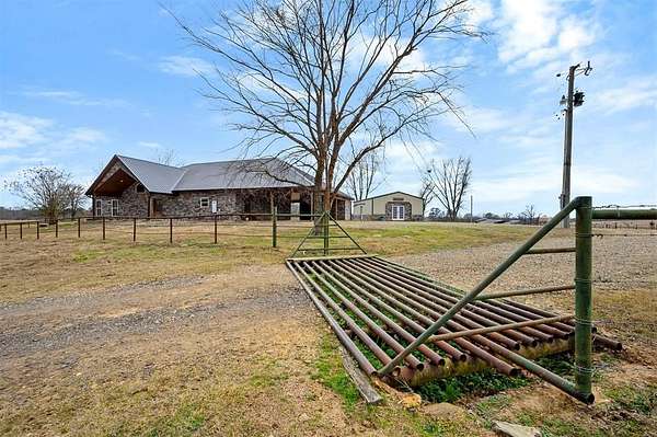 A rare and unique opportunity to own a beautifully improved equestrian estate offering both luxury living and fully functional ranch operations. This remarkable property features multiple ponds, a 150' x 250' LED-lit riding arena for nighttime training with a 10' return alley, two horse pens, and a main barn with 10 oversized horse stalls, insulated tack room with concrete floors, and a dedicated feed room. Additional improvements include a round pen for training, 10 above-ground dog kennels, and a second barn ideal for equipment storage or future expansion. This charming 3 bedroom, 2 bath home blends warmth and character with modern comfort, with rich accents and wood features. The spacious primary suite is a true retreat, offering a spa-like bath with a large rock walk-in shower, soaking tub, and gas fireplace. Two secondary bedrooms share a full bath, offering comfort and functionality for family or guests. The inviting living room overlooks the backyard and is anchored by a beautiful gas fireplace, while abundant cabinetry throughout the home provides ample storage. A well-designed mudroom welcomes you inside, providing extra kitchen storage, sink, and a laundry area large enough for double-stacked washer and dryer units. Large windows throughout flood the space with natural light and showcase the surrounding landscape. Adding more flexibility is a detached apartment with bedroom, kitchen, living area, and full bath-perfect for guests, or extended family. Outdoor amenities, include a storm shelter, welcoming front porch overlooking a serene pond, beautiful landscaping, and a 30' above-ground pool with a wood deck and covered seating area off the back. Attached oversized carport with ample parking and an attached storage room. This extraordinary property offers privacy, functionality, and charm in one unforgettable package. Don't miss this rare opportunity to make this your own-whether as your forever home, equestrian retreat, or exceptional second home.