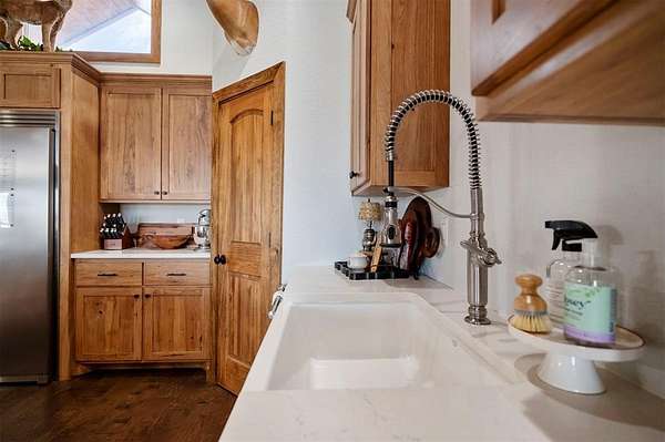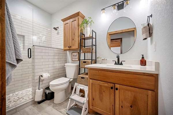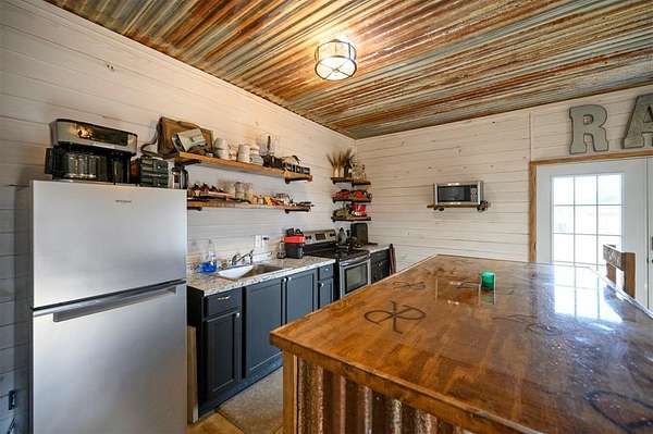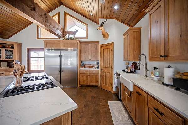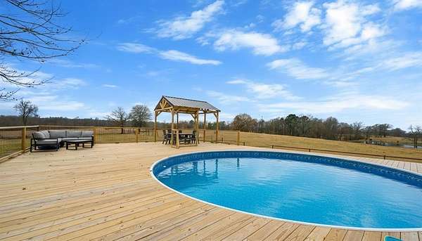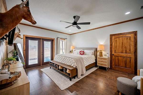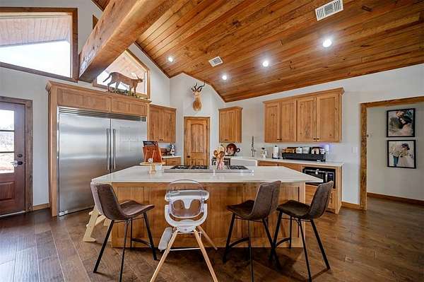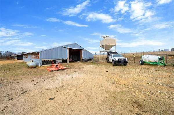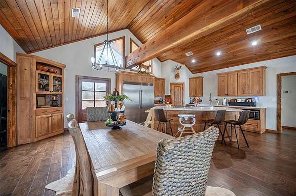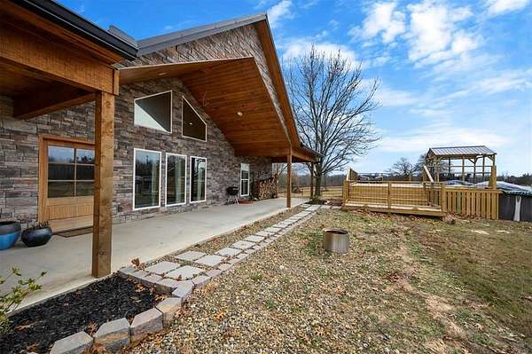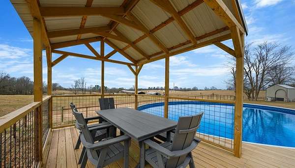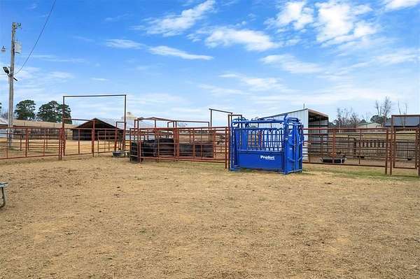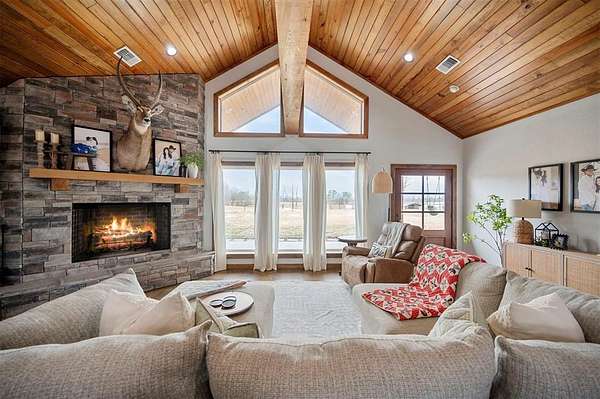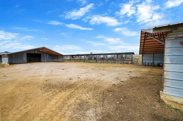 A rare and unique opportunity to own a beautifully improved equestrian estate offering both luxury living and fully functional ranch operations. This remarkable property features multiple ponds, a 150' x 250' LED-lit riding arena for nighttime training with a 10' return alley, two horse pens, and a main barn with 10 oversized horse stalls, insulated tack room with concrete floors, and a dedicated feed room. Additional improvements include a round pen for training, 10 above-ground dog kennels, and a second barn ideal for equipment storage or future expansion. This charming 3 bedroom, 2 bath home blends warmth and character with modern comfort, with rich accents and wood features. The spacious primary suite is a true retreat, offering a spa-like bath with a large rock walk-in shower, soaking tub, and gas fireplace. Two secondary bedrooms share a full bath, offering comfort and functionality for family or guests. The inviting living room overlooks the backyard and is anchored by a beautiful gas fireplace, while abundant cabinetry throughout the home provides ample storage. A well-designed mudroom welcomes you inside, providing extra kitchen storage, sink, and a laundry area large enough for double-stacked washer and dryer units. Large windows throughout flood the space with natural light and showcase the surrounding landscape. Adding more flexibility is a detached apartment with bedroom, kitchen, living area, and full bath-perfect for guests, or extended family. Outdoor amenities, include a storm shelter, welcoming front porch overlooking a serene pond, beautiful landscaping, and a 30' above-ground pool with a wood deck and covered seating area off the back. Attached oversized carport with ample parking and an attached storage room. This extraordinary property offers privacy, functionality, and charm in one unforgettable package. Don't miss this rare opportunity to make this your own-whether as your forever home, equestrian retreat, or exceptional second home.