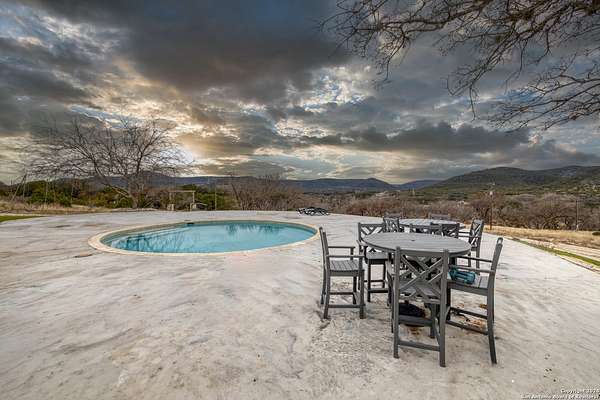 Heaven on Earth now exists in Leakey TX. Situated on 42 acres with a range of topographies including approx.. 600 Feet of West Prong of the Frio River, mountain terrain, Pecan bottom flats with 200 year old Pecan trees, wildlife galore and so much more to even list. Wonderfully situated with unbelievable Westerly views of the entire area sits a well designed completely renovated 2-story that boasts 4 bedrooms and 3.5 full baths with new plumbing, HVAC, electrical and reworked high pressure water well with a 5 stage reverse osmosis water filtration system. Large 2nd floor porch with views over the custom built swimming pool completely surrounded by turf grass and fire pit where a lifetime of memories can be made, not to mention tremendous views of the West Texas Hill Country. Included is approx.. 560 Sq ft shop/storage room located within walking distance of the house to store your ATV, tractor, Summer supplies and many others. Completely custom furnished with large mirrors/art work that make you feel like you're staying at a 6 star resort. Private, quiet, peaceful, end of the road ranchette that will make you the envy of the town for generations. Make your appointment today to see this gem before someone else does!
