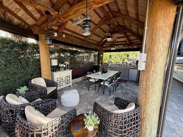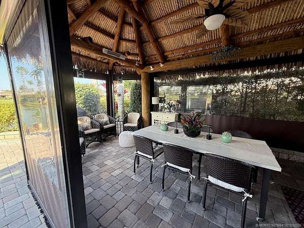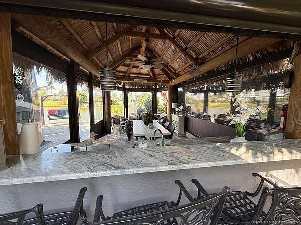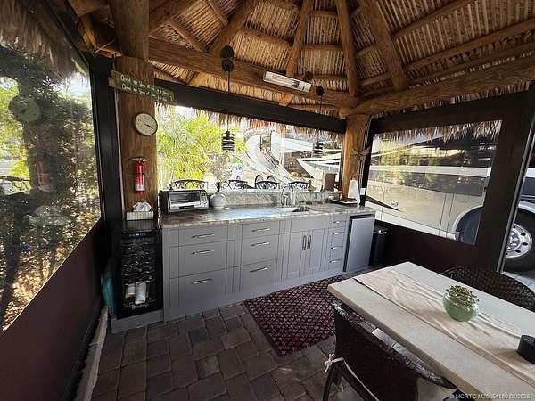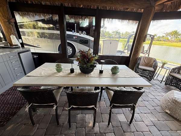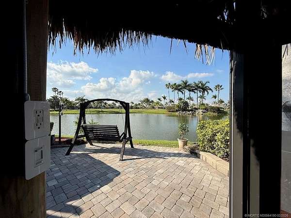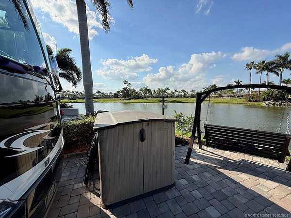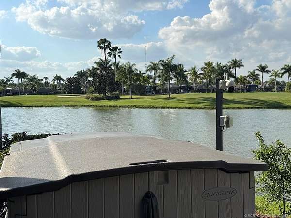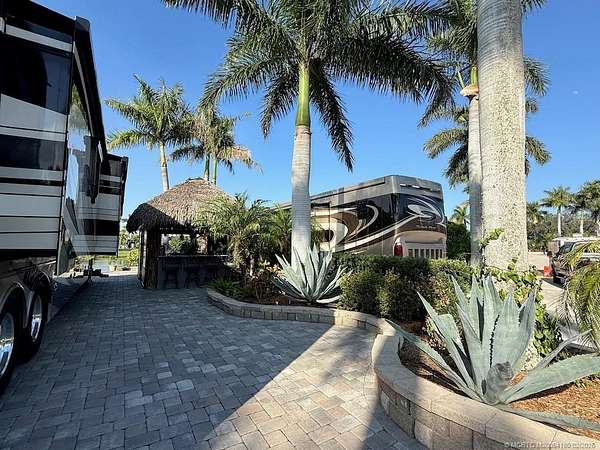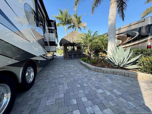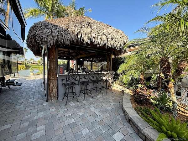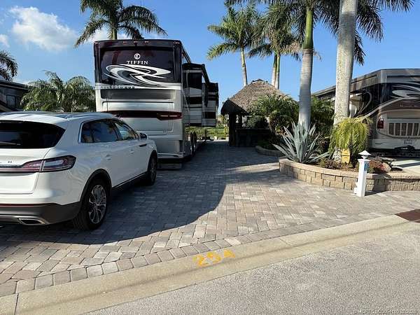 REDUCED! Luxury Pull-In Lot with Stunning Waterfall Views! Nestled in the highly sought-after Phase 2 of the resort, where royal palm-lined streets create a picturesque setting, this premium pull-in lot offers the perfect blend of privacy, comfort, and breathtaking views. The spacious tiki hut is fully enclosed with power eisenglass curtains, allowing you to relax in comfort while still enjoying the scenery. Inside, the granite-topped kitchen and bar are beautifully equipped with a wine chiller, refrigerator, and bar stools, making it the perfect spot to unwind. The thoughtfully designed layout provides ample space for a dining table and chairs, as well as a separate seating area for added relaxation. The fully paved lot is expertly landscaped with raised beds for maximum privacy, creating your own personal retreat. And for the ultimate touch, a cozy swing invites you to sit back and take in the serene, direct view of the waterfall-a truly one-of-a-kind experience!
