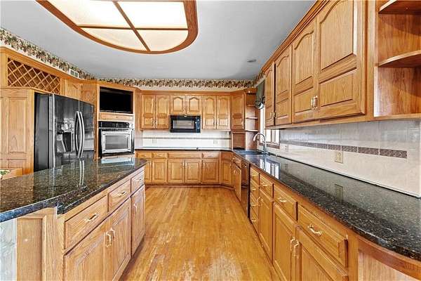 - Custom Cabinets, Kitchen Island, Pantry, Stained Cabinets, Vaulted Ceiling(s), Wet Bar