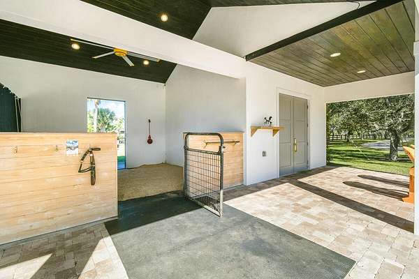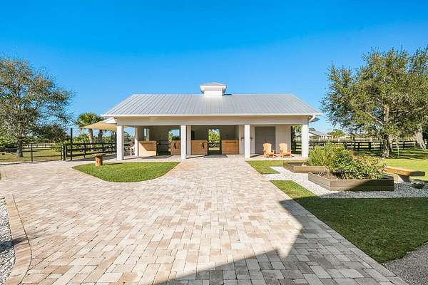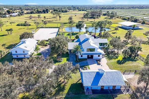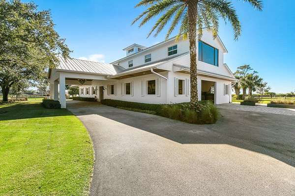 Private Gated Luxury Equestrian Estate West of Hobe Sound. Minutes to beaches, dining, shopping, I-95, Apogee Golf Club, Atlantic Fields, and The Ranch. Trailside Community is gated and features PVC white fencing for every estate throughout. This estate welcomes you with an Oak-lined long driveway with modern teak gates, keypad entry and scenic views in every direction.This estate features a total of 3 Bedrooms, 3.5 baths with open floor plan, gourmet kitchen, gas range, walk-in pantry, bar area, dining room, sitting room, gym with steam shower, outdoor shower, walk-in primary closet, large primary bath, two patios off main living area, all-glass modern living room, and expansive outdoor entertaining areas.