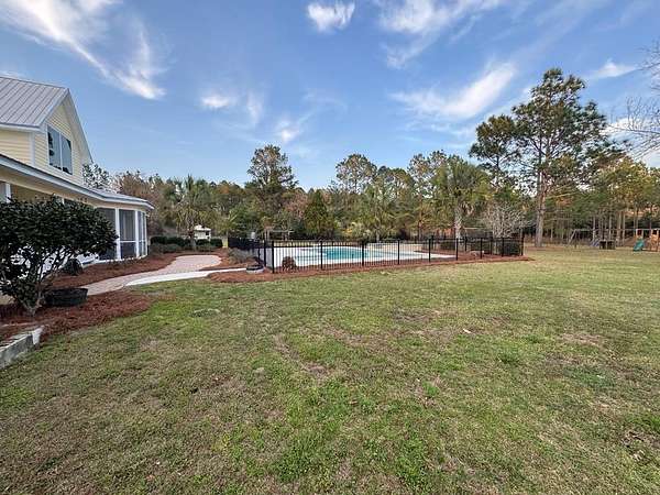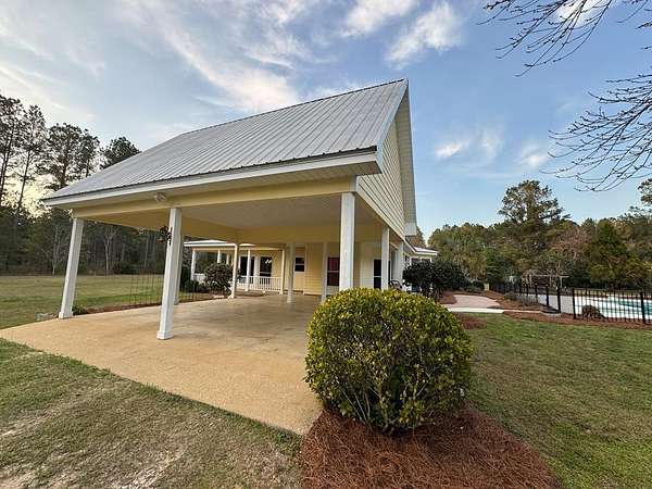 Discover the perfect combination of luxury, comfort, and versatility with this exceptional property set on 48 beautiful acres. This home features 3 bedrooms, 2 full bathrooms, and 1 half bathroom, along with a resort style pool. At the center of the home is a spacious kitchen that opens to the living room, creating an inviting area ideal for entertaining and everyday living. The kitchen is thoughtfully designed with custom wood cabinetry, quartz countertops, a custom backsplash, a gas cooktop and double ovens. The primary suite has plenty of windows to take in the scenic views. It offers a peaceful retreat with a fireplace and private porch that overlooks the resort style pool. The 48 acres provide endless possibilities. Planted pines and pecan trees create a beautiful entrance to your property. The wooded areas are perfect for deer and turkey hunting. You will also find an abundance of fruit trees and muscadine grapevines. The property is already fenced and cross-fenced. This offers an ideal setup for livestock and a chicken coop is already in place. Additional improvements include four workshops, two wells, a playhouse and playground for the kids. You will feel like you are on vacation every day with the resort style pool. When you are done swimming, relax in the built-in hot tub under the palm trees. This is what you need to enjoy quiet evenings or host friends and family. Don't miss this rare opportunity to own this one-of-a-kind property.