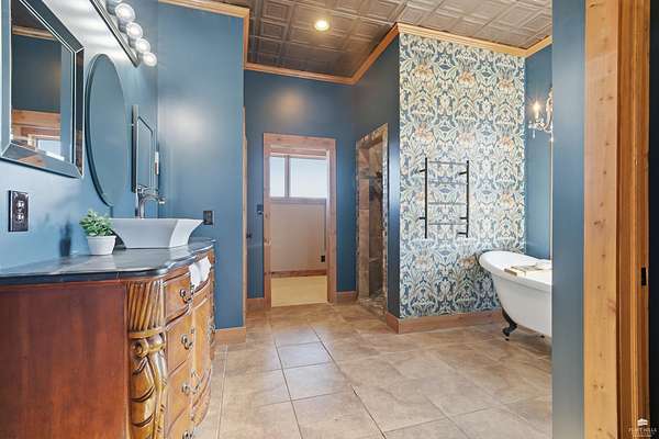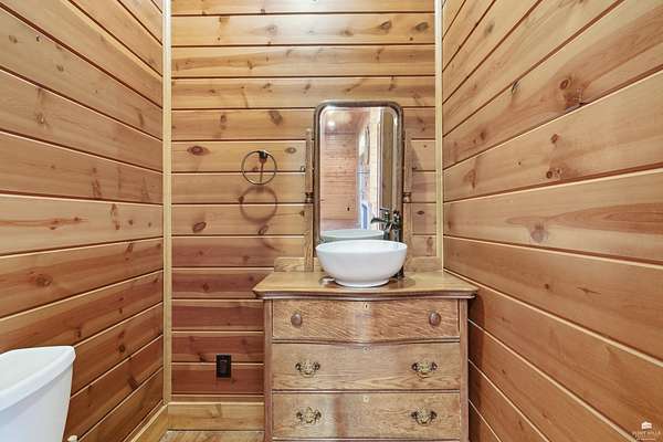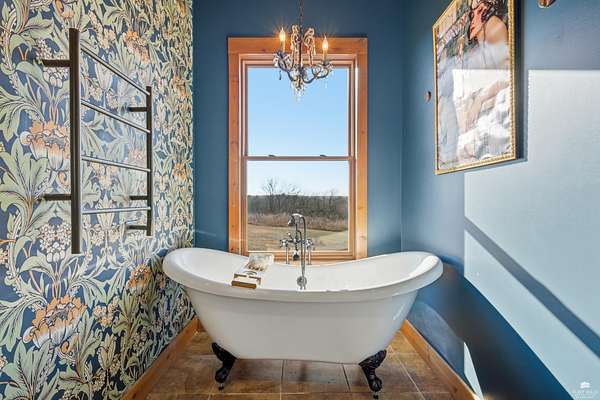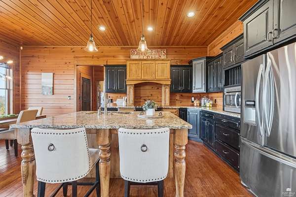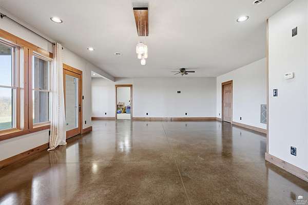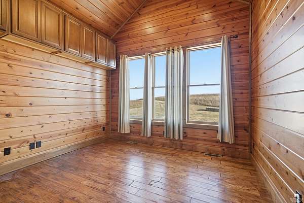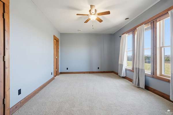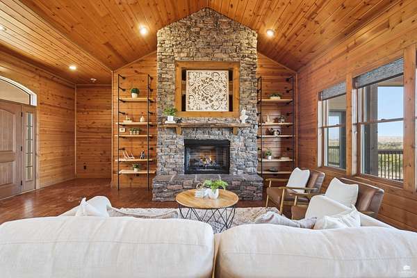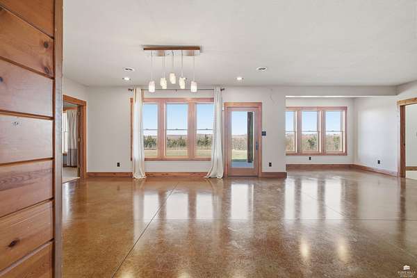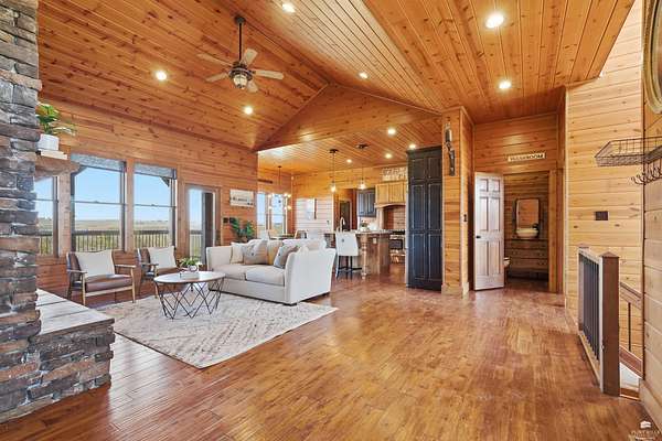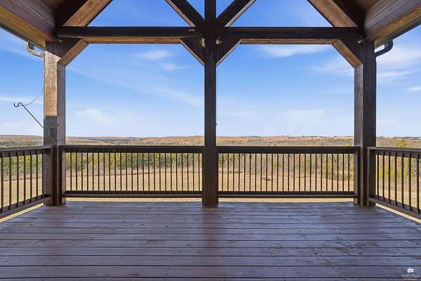 Unparalleled Flint Hills estate on 54+ acres. This custom-built 4BR, 3.5BA rustic home showcases refined craftsmanship throughout, including premium Custom Woods cabinetry, radiant in-floor heat on both levels, and a dramatic floor-to-ceiling stone fireplace anchoring the main living space with lodge-style elegance. Fresh paint, new carpet, and a walk-out lower level with stained concrete floors complete the polished interior. Dual access decking captures some of the most breathtaking views in the region. The acreage is a rare blend of rolling native terrain, mature timber, abundant wildlife, and a naturally spring-fed pond-ideal for premier hunting, fishing, and nature experiences. A 30x50 shop with lean-to adds valuable storage and a workshop. Opportunities of this caliber are exceptionally scarce. Whether envisioned as a private luxury retreat, or an upscale hunting lodge, this property delivers unmatched beauty, versatility, and opportunity!