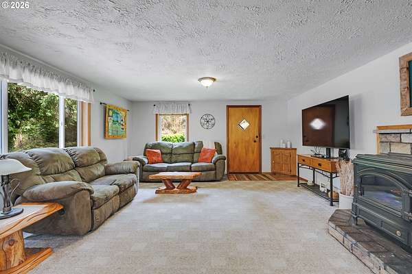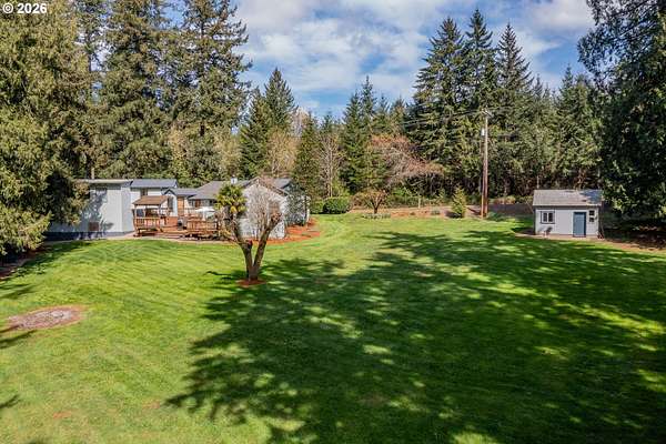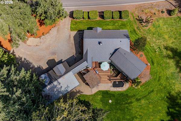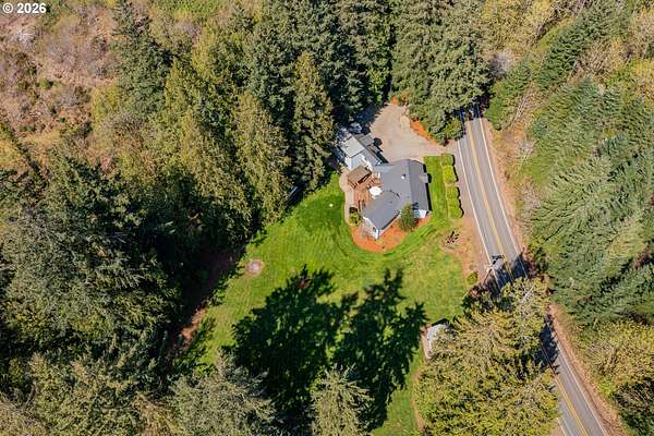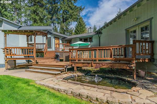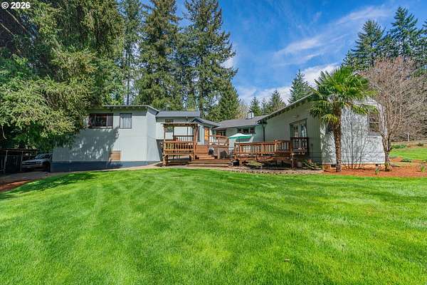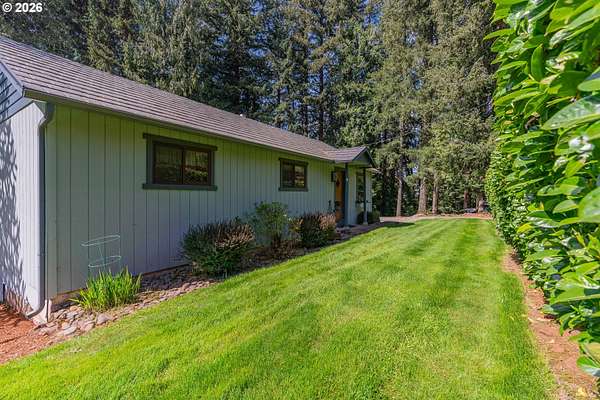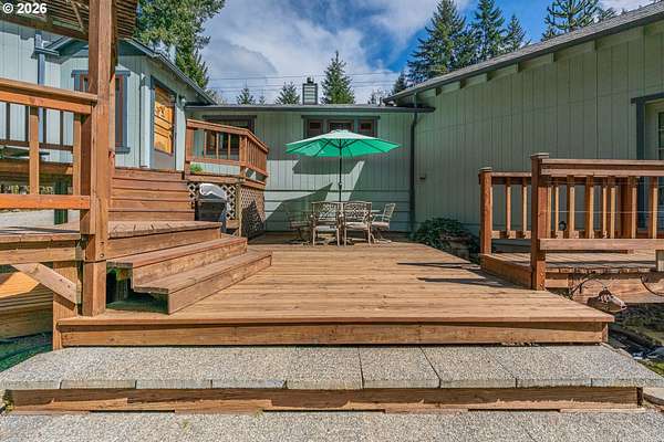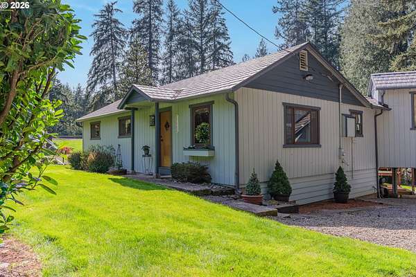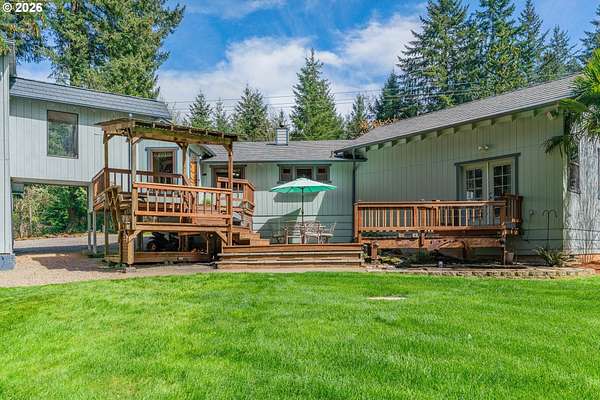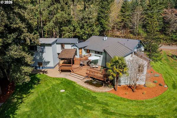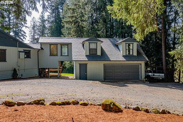 Creekside setting on 1.58 acres with a spacious, inviting layout designed for comfortable living. This 2,305 sq ft home offers 3 bedrooms and 2 bathrooms, including a generously sized primary suite that provides a peaceful retreat. The large family room creates an ideal space for gatherings, entertaining, or relaxing at home. Enjoy multiple outdoor living areas with a three-tier deck for soaking up the sun and a covered patio for year-round enjoyment. The property is bordered by year-round Buckner Creek and surrounded by mature fir and cedar trees, creating a private, park-like setting with natural beauty in every direction. Additional features include a 12' x 16' pumphouse with a roll-up door, perfect for storing a small vehicle, tractor, or equipment, along with an oversized 2-car garage offering ample storage space. Valuable old-growth timber adds to the overall appeal and potential value, while the usable acreage provides plenty of room for gardening, recreation, or simply enjoying the peaceful Oregon surroundings.