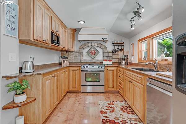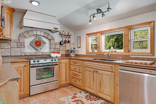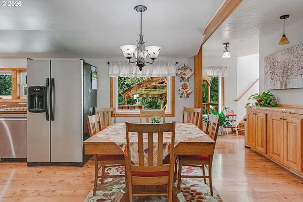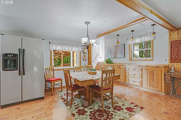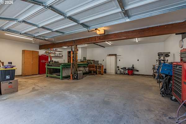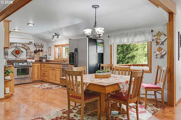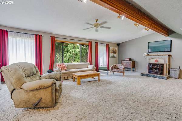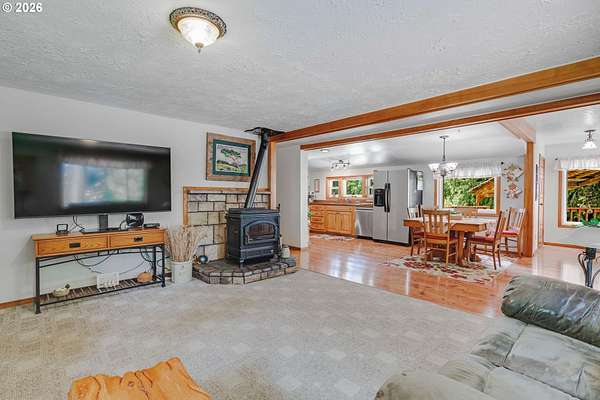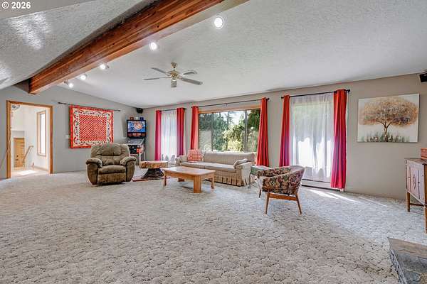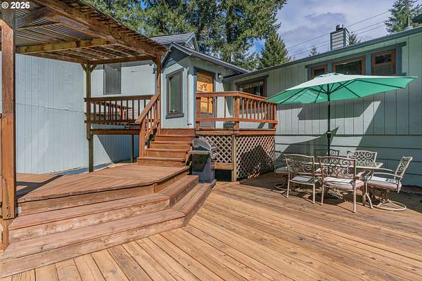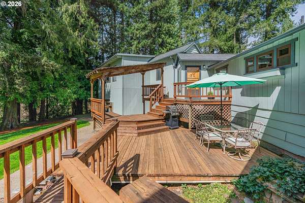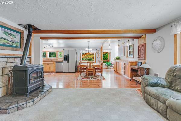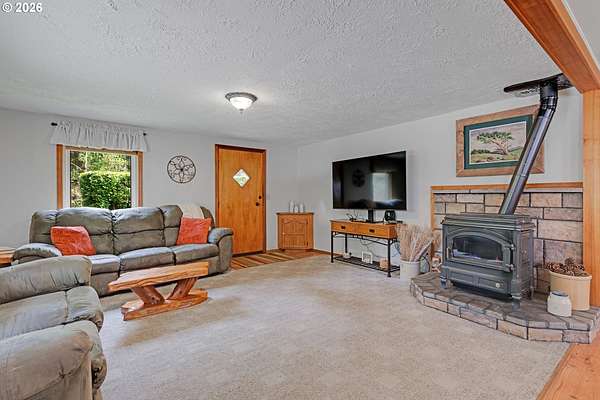 Creekside setting on 1.58 acres with a spacious, inviting layout designed for comfortable living. This 2,305 sq ft home offers 3 bedrooms and 2 bathrooms, including a generously sized primary suite that provides a peaceful retreat. The large family room creates an ideal space for gatherings, entertaining, or relaxing at home. Enjoy multiple outdoor living areas with a three-tier deck for soaking up the sun and a covered patio for year-round enjoyment. The property is bordered by year-round Buckner Creek and surrounded by mature fir and cedar trees, creating a private, park-like setting with natural beauty in every direction. Additional features include a 12' x 16' pumphouse with a roll-up door, perfect for storing a small vehicle, tractor, or equipment, along with an oversized 2-car garage offering ample storage space. Valuable old-growth timber adds to the overall appeal and potential value, while the usable acreage provides plenty of room for gardening, recreation, or simply enjoying the peaceful Oregon surroundings.