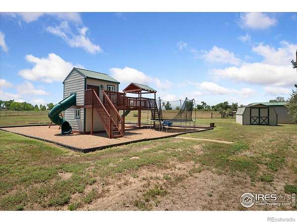 Welcome to the kind of property that makes you slow down, breathe deep, and say, "Yep...this is the one." Tucked away on 2.37 acres in Larimer County, this 5-bedroom, 3-bath two-story home offers the space, freedom, and lifestyle so many buyers are craving-without giving up easy access to Northern Colorado amenities. Inside, the layout is warm and functional with room to spread out. The finished basement is a standout, featuring a spacious rec room, a dedicated theater space for movie nights or game days, plus two flex rooms that easily adapt to a home gym, office, hobby room, or guest space. A radon mitigation system is already in place for peace of mind. But let's talk about outdoor living-because this is where the home truly shines. An impressive 1,800 sq ft composite deck sets the stage for unforgettable gatherings, complete with two pergolas, a built-in BBQ with direct natural gas, smoker, mini fridge, and a firepit overlooking your private acreage. Whether it's summer cookouts, fall evenings by the fire, or quiet mornings with coffee, this space delivers. The oversized play structure is more than meets the eye: the upper level is fully finished with carpet, insulation, and electricity, while the lower level doubles as a powered workshop. Add in fenced raised garden beds with drip irrigation, room for animals, two outdoor storage sheds, space for an RV or boat, and 2.4 shares of irrigation water (contact agent for details and pricing), and you've got a property that truly works as hard as it plays. Additional perks include an EPA-compliant wood-burning fireplace with heat distribution fan, whole-house generator, electric garage heater, and a remote-activated gate. With no active HOA for over 20 years, this is a rare opportunity to enjoy space, privacy, and flexibility-your land, your lifestyle, your rules.