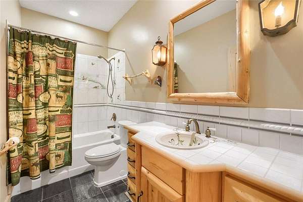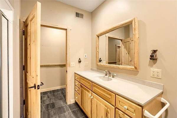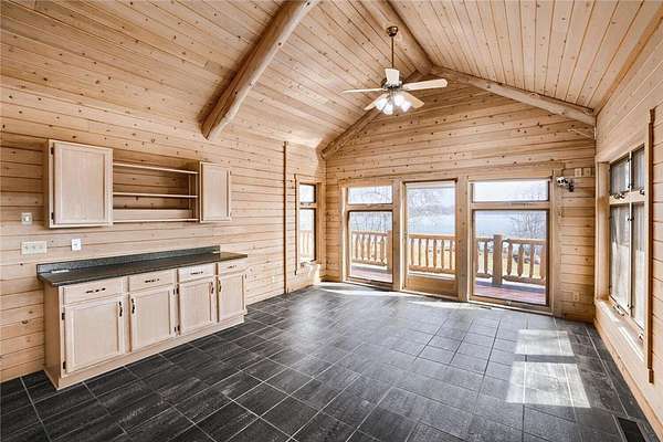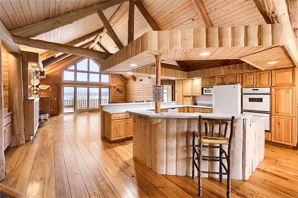 The main-level living room perfectly balances design and comfort, showcasing 15-foot ceilings and custom hand-scribed logs imported from Michigan. The large lakeside windows draw your gaze to stunning views and provide access to an expansive lakeside deck. A beautiful fireplace serves as a striking focal point in this space, exuding warmth and coziness—ideal for family gatherings or quiet evenings by the fire.