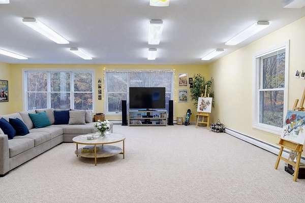 Set on 20 peaceful acres across from the conserved Mud Pond trail network, this thoughtfully designed 2-bedroom, 2-bath contemporary ranch offers comfortable single-level living in a private, nature-filled setting. A welcoming covered porch opens into a light-filled living room with a vaulted ceiling and expansive windows that frame the surrounding landscape. Oak hardwood floors extend throughout the main living areas and bedrooms. The updated kitchen features white cabinets, stainless steel appliances, granite countertops, and a classic subway tile backsplash, with easy access to a relaxing sunroom and back deck. The first-floor primary suite includes a full bath, built-ins, and a changing area with two large closets. A spacious multi-purpose room provides excellent flexibility--perfect for a home business, a cozy family room or a dedicated workout space. Its layout and privacy make it easy to tailor to your lifestyle. The finished walkout lower level adds remarkable versatility with a den, office, laundry room, home theater, two cedar closets, storage areas, and another multi-purpose room with a garage door--ideal for gardening projects, workshop needs, pet care, or specialty vehicle storage. Additional highlights include a spacious two-car attached garage, large shed, and generator. Surrounded by nature yet close to Williston conveniences, this property offers a rare blend of privacy, easy living, and room to enjoy the hobbies and lifestyle you love.