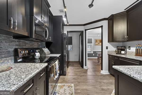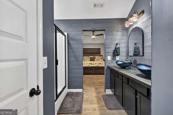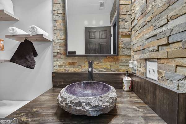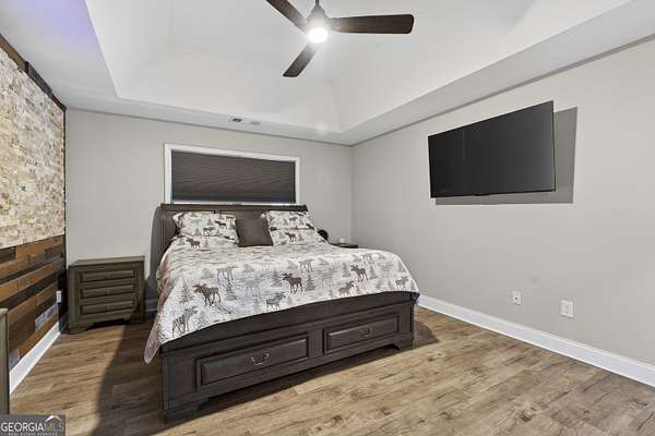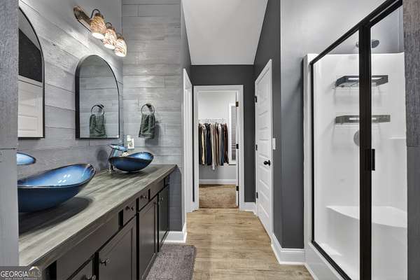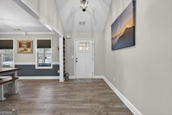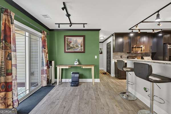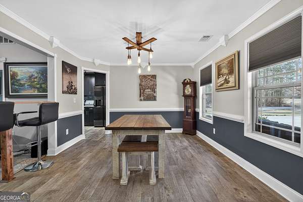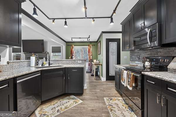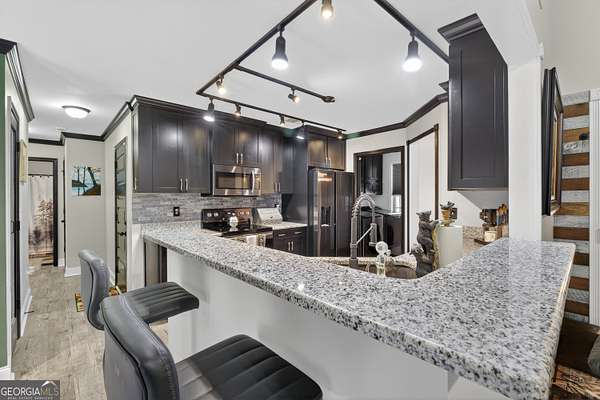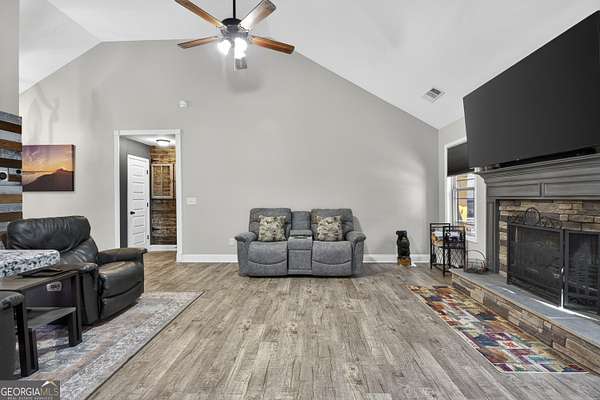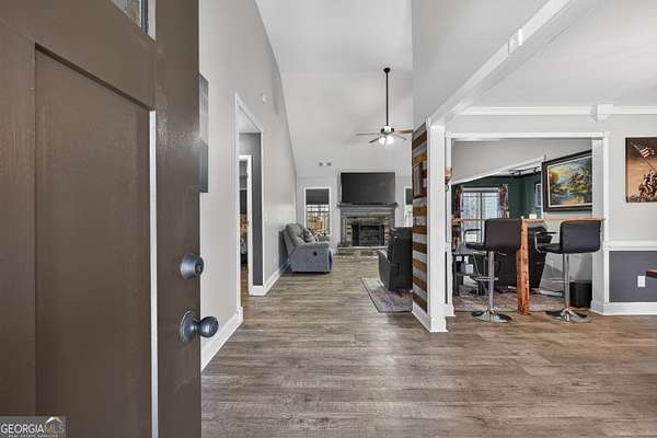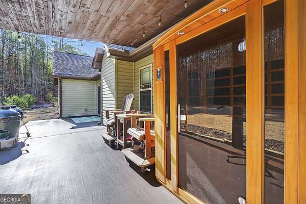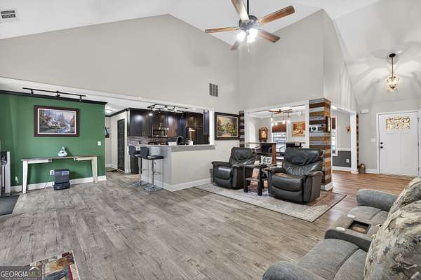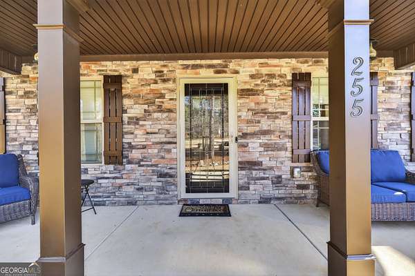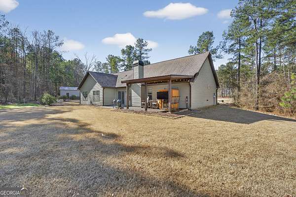 Built in 2018, this exceptional 3-bedroom, 2-bath split-bedroom home is truly loaded with upgrades and thoughtful custom details throughout. From the moment you step inside, you'll notice luxury vinyl plank flooring throughout, wood accents in the living area, a wood-burning fireplace, and elegant fluted trim around openings. Crown molding highlights the kitchen, adjacent open living space, hallway, and dining room, creating a cohesive and upscale feel.The kitchen is a showstopper, featuring granite countertops, a spacious sitting bar, custom cabinetry, track lighting, and striking glass pantry and laundry doors. The guest bathroom offers a one-of-a-kind design with a custom wooden countertop, rock floating bowl, and rock ledger surround-an impressive upgrade rarely found at this price point.The dining room is enhanced with crown molding, fluted trim work, and lower accent paint, perfect for entertaining. The primary suite features a rock ledger accent wall, an electric in-wall fireplace, and a vaulted ceiling. The primary bath boasts a double vanity with a new custom wooden countertop, dual floating bowls, and waterfall faucets. Additional interior features include custom Levolor honeycomb blinds throughout and fresh interior paint, along with newly painted exterior columns and trim. Outside, the property truly shines. Enjoy a 3-car garage, a large covered concrete patio, and wooded views behind the home for ultimate privacy. The fully sodded yard includes a 7-zone sprinkler system and landscaping rock throughout, making this yard the envy of the neighborhood. For those needing space for hobbies, equipment, or toys, this property delivers: 20x30 detached building on asphalt with two 9-ft doors and a dedicated asphalt driveway, two 16x12 lofted barnes, golf chipping area, plenty of room for all your toys and storage needs.This is a truly turn-key property with unmatched upgrades, amenities, and detached buildings. Homes like this rarely come available-don't let this one get away.