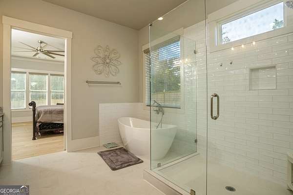 - Bookcases, Double Vanity, Entrance Foyer, High Ceilings, Master On Main Level, Separate Shower, Soaking Tub, Split Bedroom Plan, Tile Bath, Tray Ceiling(s), Vaulted Ceiling(s), Walk-In Closet(s)