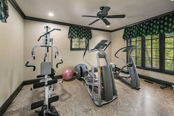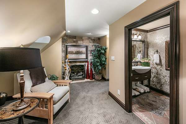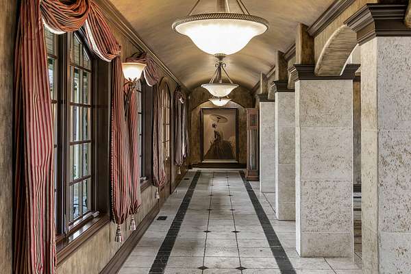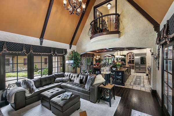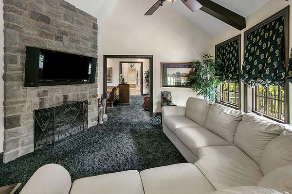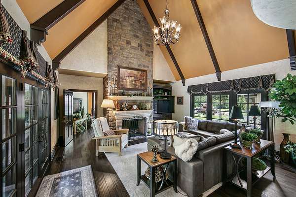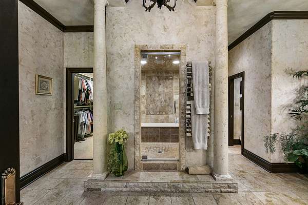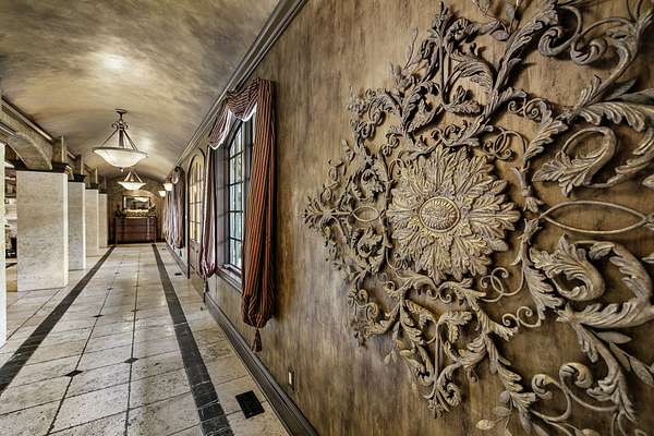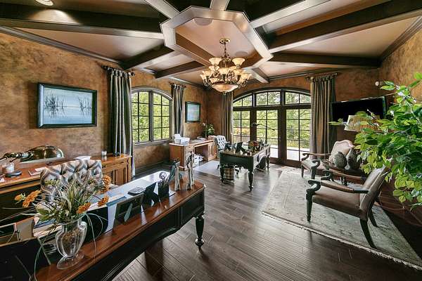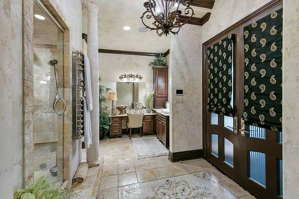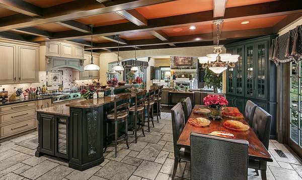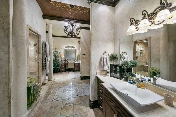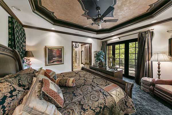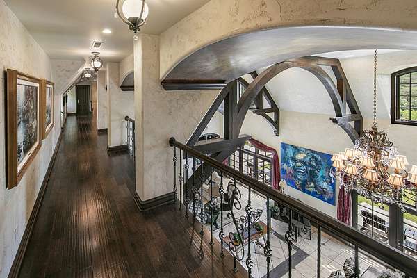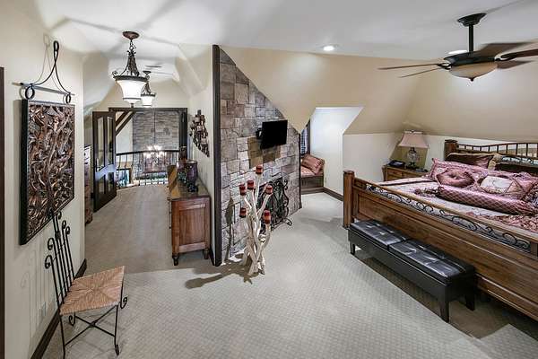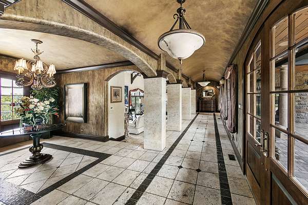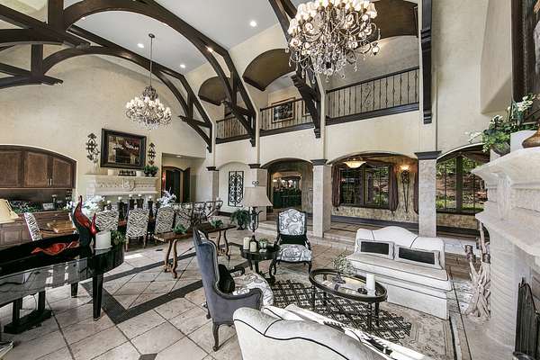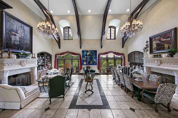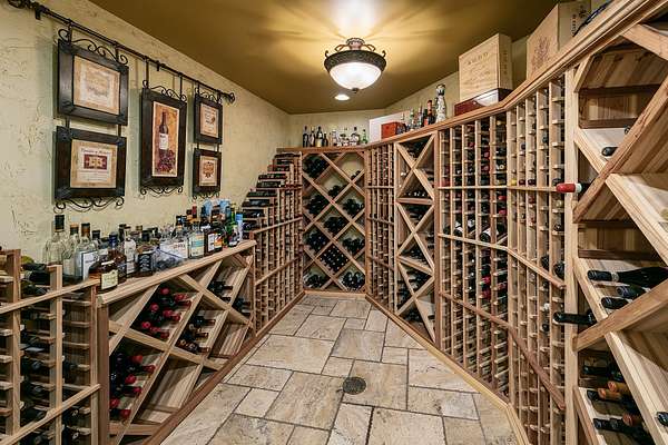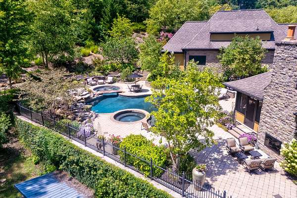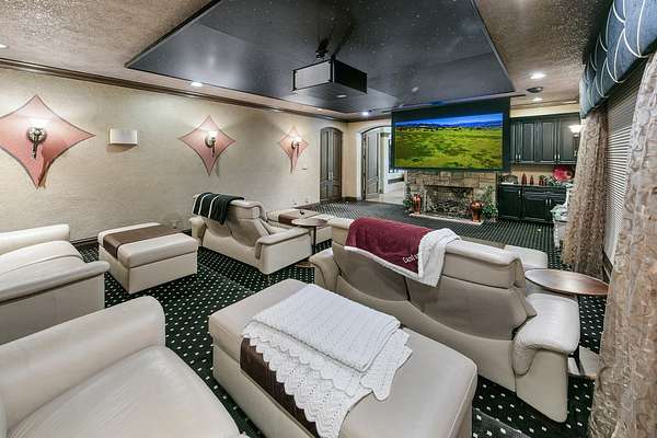 Resort-style amenities include a custom granite saltwater grotto pool, spa, theater room, 1,000-bottle temperature-controlled wine cellar, fitness room, outdoor fireplace, outdoor TV projector, hunting grounds, fishing lake, and even a place to land your helicopter.