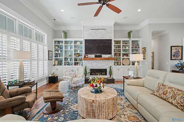 Features include Anderson windows, Asian walnut wood floors throughout, plantation shutters, a Valour fireplace, surround sound, Bosch HVAC, and an on-demand HE water heater. The primary suite features heated floors, a marble shower, and a bidet. The kitchen includes granite countertops, a gas stove with pot filler, and quality craftsmanship throughout. Additional highlights include a 6x6 safe room, spray foam insulation, encapsulated crawlspace, metal roof, and a 3-car attached garage. A 2,400 sq ft detached shop/RV garage offers RV hookups, pumps, a half bath on 6-inch concrete, plus an outdoor kitchen with a Summerset gas grill.
