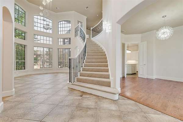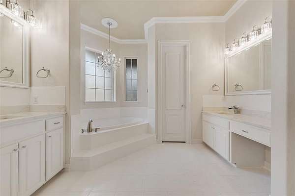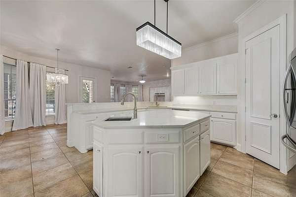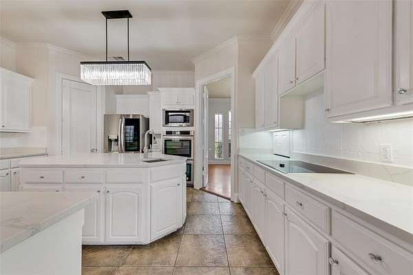- Chandelier, Decorative Lighting, Double Vanity, Kitchen Island, Open Floorplan, Pantry, Tile Counters, Vaulted Ceiling(s), Walk-In Closet(s)