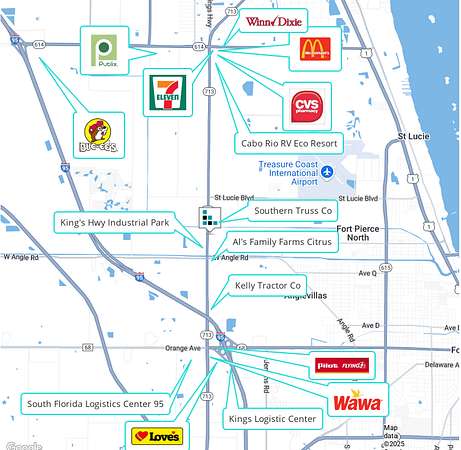 Surrounded by over 2 million square feet of newly developed industrial warehouse space within a 3- mile radius, this site sits in one of Fort Pierce's most active industrial corridors. It is also just 2.8 miles south of Indrio Rd, the future site of a new Buc-ee's and more than 8,000 proposed residential units. With flexible zoning, strong infrastructure, and immediate development potential, this property is ideally positioned for industrial or service-based users seeking growth in a rapidly expanding market.