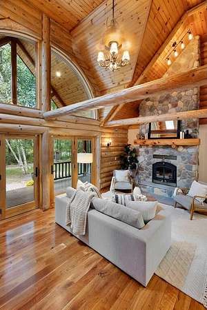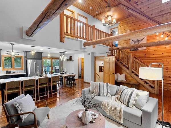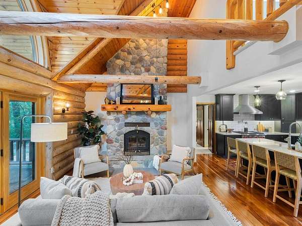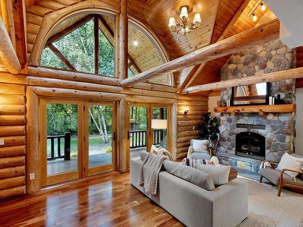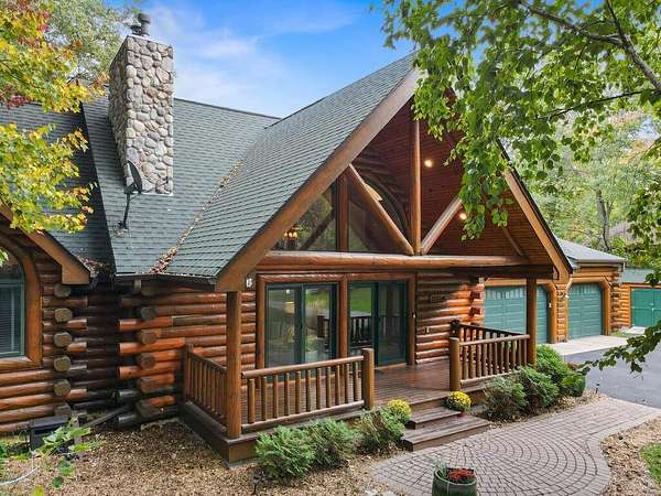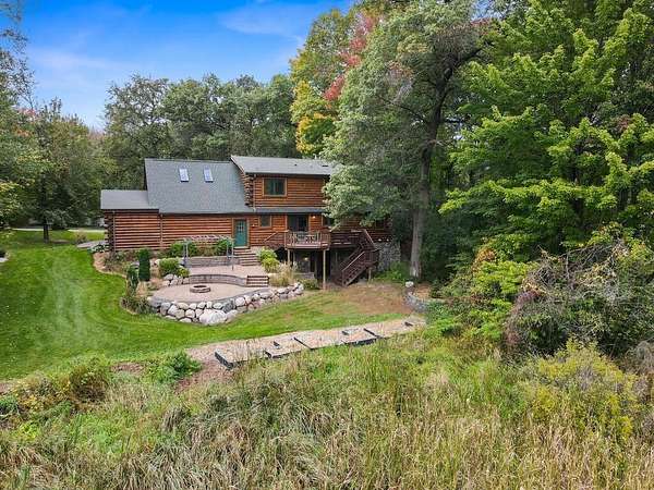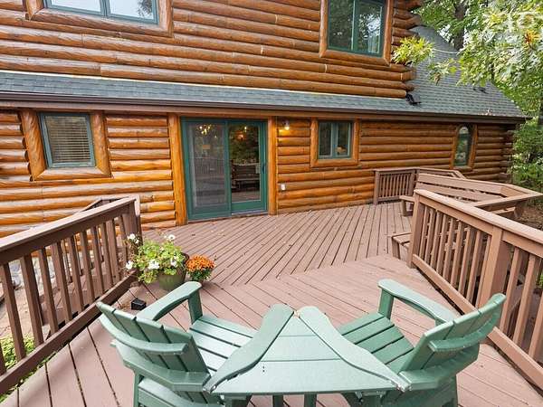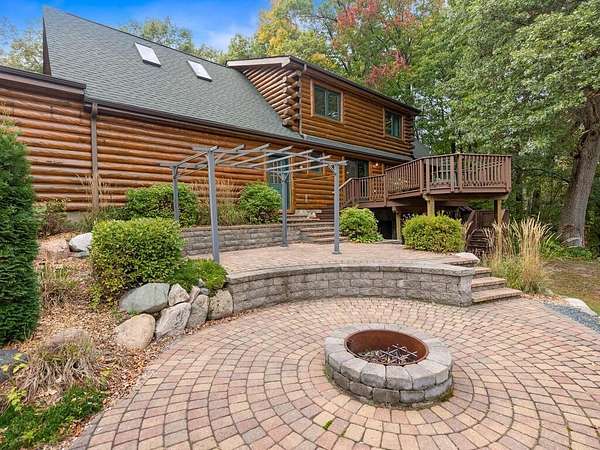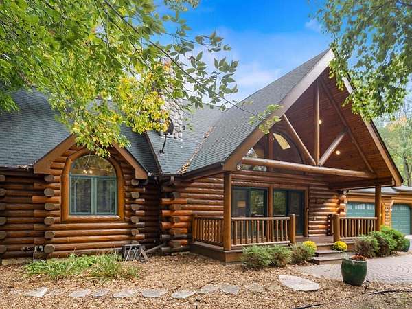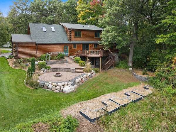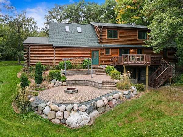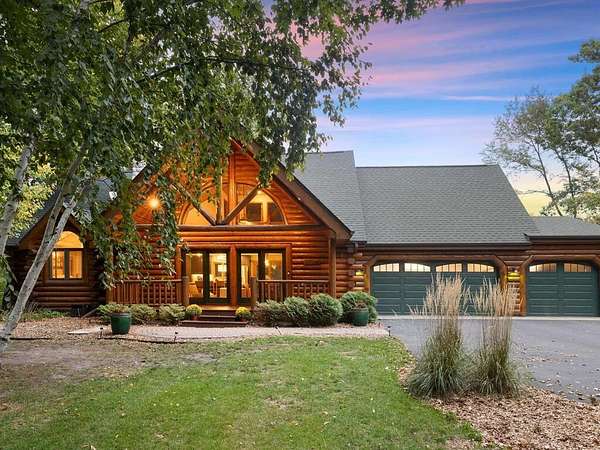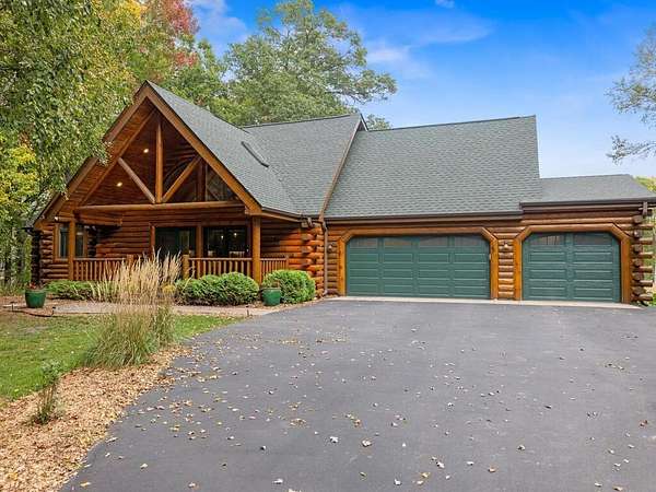 Rustic Elegance! Custom Log Home on 1.5 Acres w/ Vaulted Ceilings, Walkout, & High-End Finishes - Wyoming, MN - Stunning one-owner home nestled on beautifully landscaped land near Comfort Lake! Built in 1999, original owner, this meticulously maintained 4BR + flex/5th BR, 4BA home offers over 3,000 sq ft of warm, rustic charm. Enjoy vaulted ceilings, real fieldstone wood-burning fireplace, log staircases, and custom milled cherry wood floors. Main-level primary suite with walk-in closet and remodeled bath. Kitchen and great room remodeled in 2021 with Wolf gas range, large island, LED lighting, and more. Walkout lower level with in-floor heat, finished in 2013. Loft catwalk, skylights, upper office with vaulted ceiling, and a massive covered front porch with dramatic log detailing. Backyard oasis features tiered paver patios, fire pit, raised garden beds, and wooded wetland views. Updated HVAC (2018), Renewal by Andersen windows (2021), roof (2014), water softener system (2020), and whole house carpet (2023). Septic is compliant. Private well & septic. Seller prefers closing before the end of the year. Make this your home in time to decorate for the holidays