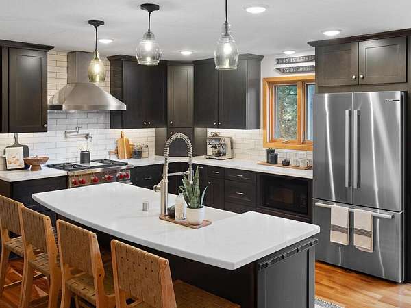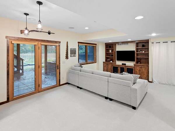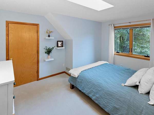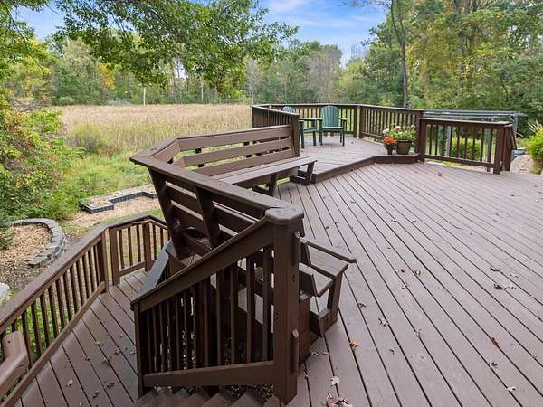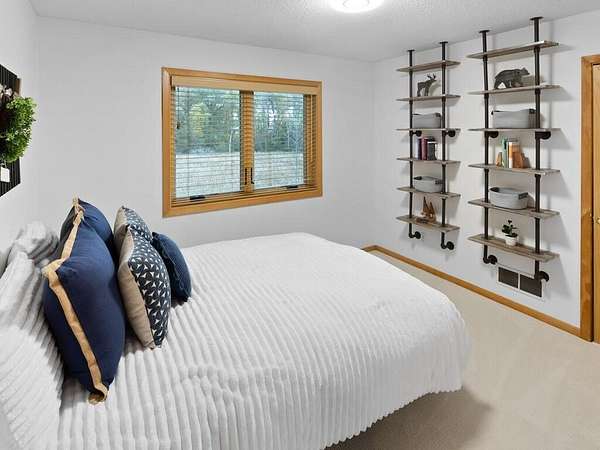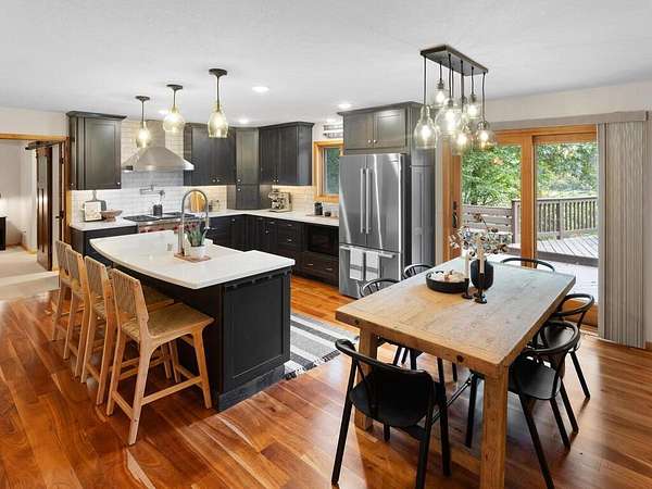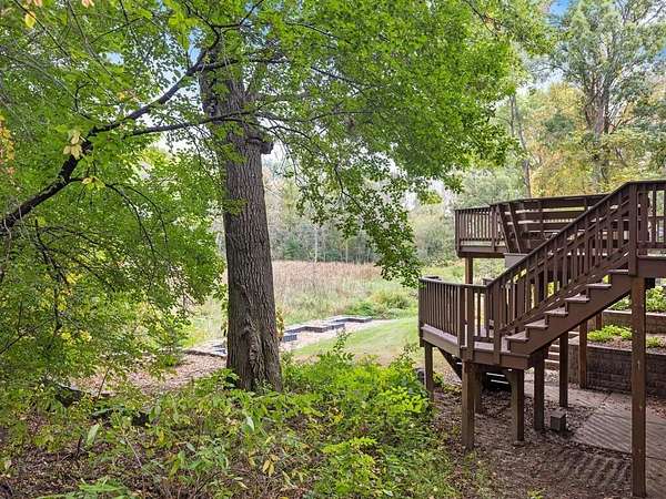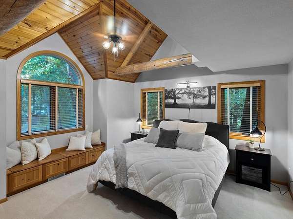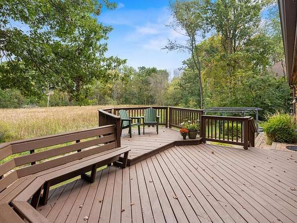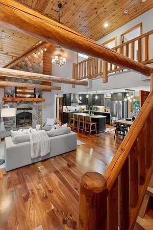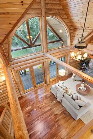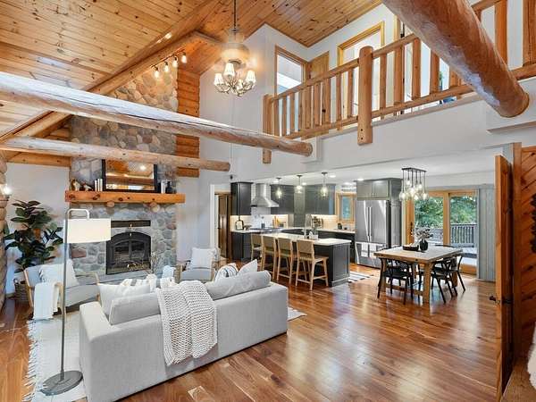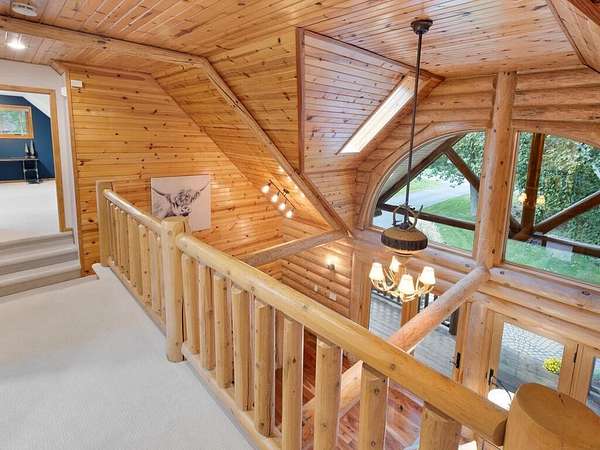 Rustic Elegance! Custom Log Home on 1.5 Acres w/ Vaulted Ceilings, Walkout, & High-End Finishes - Wyoming, MN - Stunning one-owner home nestled on beautifully landscaped land near Comfort Lake! Built in 1999, original owner, this meticulously maintained 4BR + flex/5th BR, 4BA home offers over 3,000 sq ft of warm, rustic charm. Enjoy vaulted ceilings, real fieldstone wood-burning fireplace, log staircases, and custom milled cherry wood floors. Main-level primary suite with walk-in closet and remodeled bath. Kitchen and great room remodeled in 2021 with Wolf gas range, large island, LED lighting, and more. Walkout lower level with in-floor heat, finished in 2013. Loft catwalk, skylights, upper office with vaulted ceiling, and a massive covered front porch with dramatic log detailing. Backyard oasis features tiered paver patios, fire pit, raised garden beds, and wooded wetland views. Updated HVAC (2018), Renewal by Andersen windows (2021), roof (2014), water softener system (2020), and whole house carpet (2023). Septic is compliant. Private well & septic. Seller prefers closing before the end of the year. Make this your home in time to decorate for the holidays